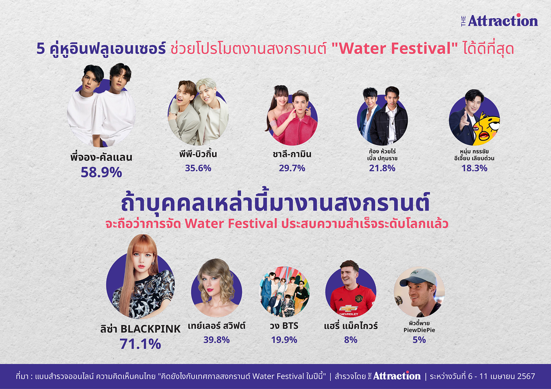 เมื่อถามถึงคนดังคู่หูที่มีพลังดึงดูดอยากให้ช่วยโปรโมตงานสงกรานต์ในปีนี้ อันดับหนึ่งเป็นไปตามความคาดหมาย คือสองหนุ่มที่ทำคนไทยใจฟูเกือบทั้งประเทศ พี่จอง-คัลแลน 58.9% อันดับที่ 2 คือ พีพี-บิวกิ้น 35.6% อันดับที่ 3 คือ ชาลี-กามิน 29.7% อันดับที่ 4 คือ ก้อง ห้วยไร่ – เบิ้ล ปทุมราช 21.8% และอันดับที่ 5 คือ หนุ่ม กรรชัย – อีเจี๊ยบ เลียบด่วน 18.3% ส่วนสาวลิซ่า BLACKPINK ยังไม่หลุดโพลแฟน ๆ โหวตมากที่สุด อันดับ 1 ถึง 71.1% ในหัวข้อถ้าใครมางานสงกรานต์จะถือว่าการจัด Water Festival ประสบความสำเร็จระดับโลกแล้ว อันดับที่ 2 คือ เทย์เลอร์ สวิฟต์ 39.8% อันดับที่ 3 คือ วง BTS 19.9% อันดับที่ 4 คือ แฮรี่ แม็คไกวร์ 8% และอันดับที่ 5 คือ พิวดี้พาย PewDiePie 5%