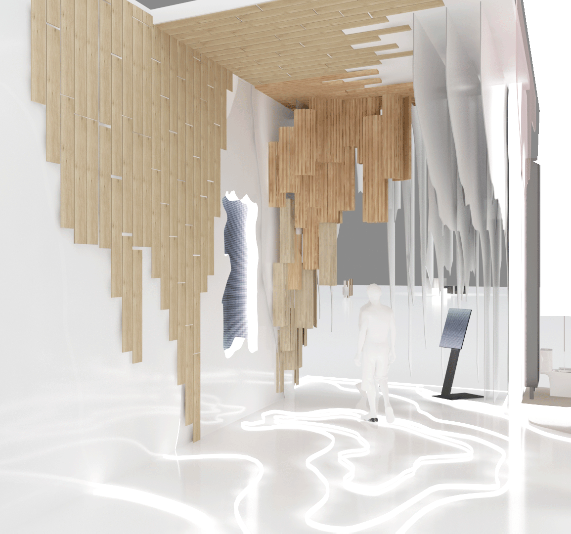 2) LAND REFORM นำเสนอผ่านการออกแบบพื้นที่ให้ทุกอย่างให้อยู่เหนือพื้นดิน โดยตกแต่งผลิตภัณฑ์ให้อยู่บนผนัง และเพดาน เพื่อสะท้อนผลกระทบจากน้ำท่วมทำให้แผ่นดินจมอยู่ในน้ำทั้งหมด ภายในฮอลล์จึงนำเสนอผลิตภัณฑ์แผ่นพื้นบุผนังและและเพดานโดย Ultra Veneer Flooring – LT By COTTO ซึ่งได้รับการรองรับจาก SCG GREEN CHOICE ช่วยส่งเสริมสิ่งแวดล้อมและสุขอนามัยที่ดี ประหยัดพลังงาน ลดโลกร้อน ลดการใช้ทรัพยากรธรรมชาติ ยืดอายุการใช้งาน และได้รับการรับการรองรับจาก VIRGIN MATERIALS ว่าปราศจากสารเคมีอันตรายและฟอร์มาลดีไฮด์ ใช้กระบวนการผลิต Zero Waste รวมทั้งอายุการใช้งานที่นานกว่า World Class Certification