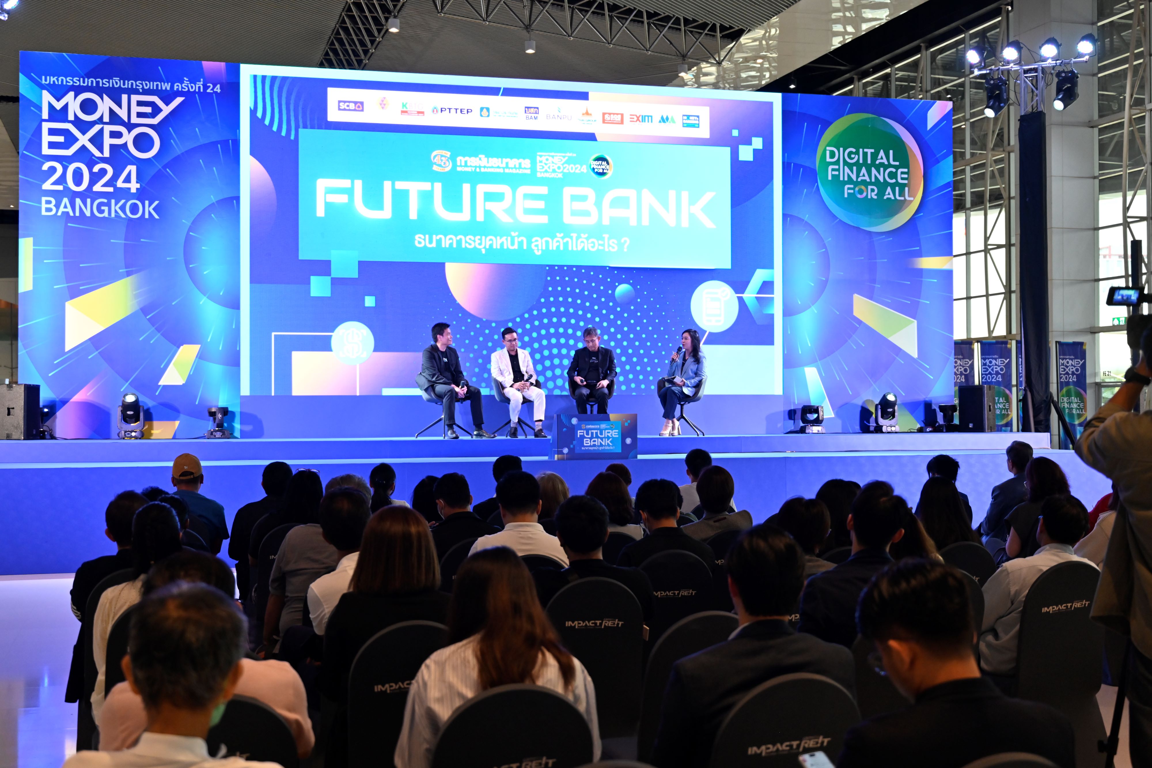 งานมหกรรมการเงินกรุงเทพ ครั้งที่ 24 MONEY EXPO 2024 BANGKOK จัดโดย วารสารการเงินธนาคาร วันที่ 16-19 พฤษภาคม 2567 มียอดธุรกรรมออฟไลน์และออนไลน์รวมกว่า 24,700 ล้านบาท สินเชื่อบ้าน/รีไฟแนนซ์บ้านฮิตติดอันดับ 1 มียอดขอกู้กว่า 12,810 ล้านบาท ผู้ประกอบการยื่นกู้สินเชื่อเอสเอ็มอีกว่า 7,850 ล้านบาท ประชาชนลงทุนซื้อประกันชีวิต/ประกันภัย/ประกันสุขภาพ รวมทุนประกันกว่า 1,080 ล้านบาท