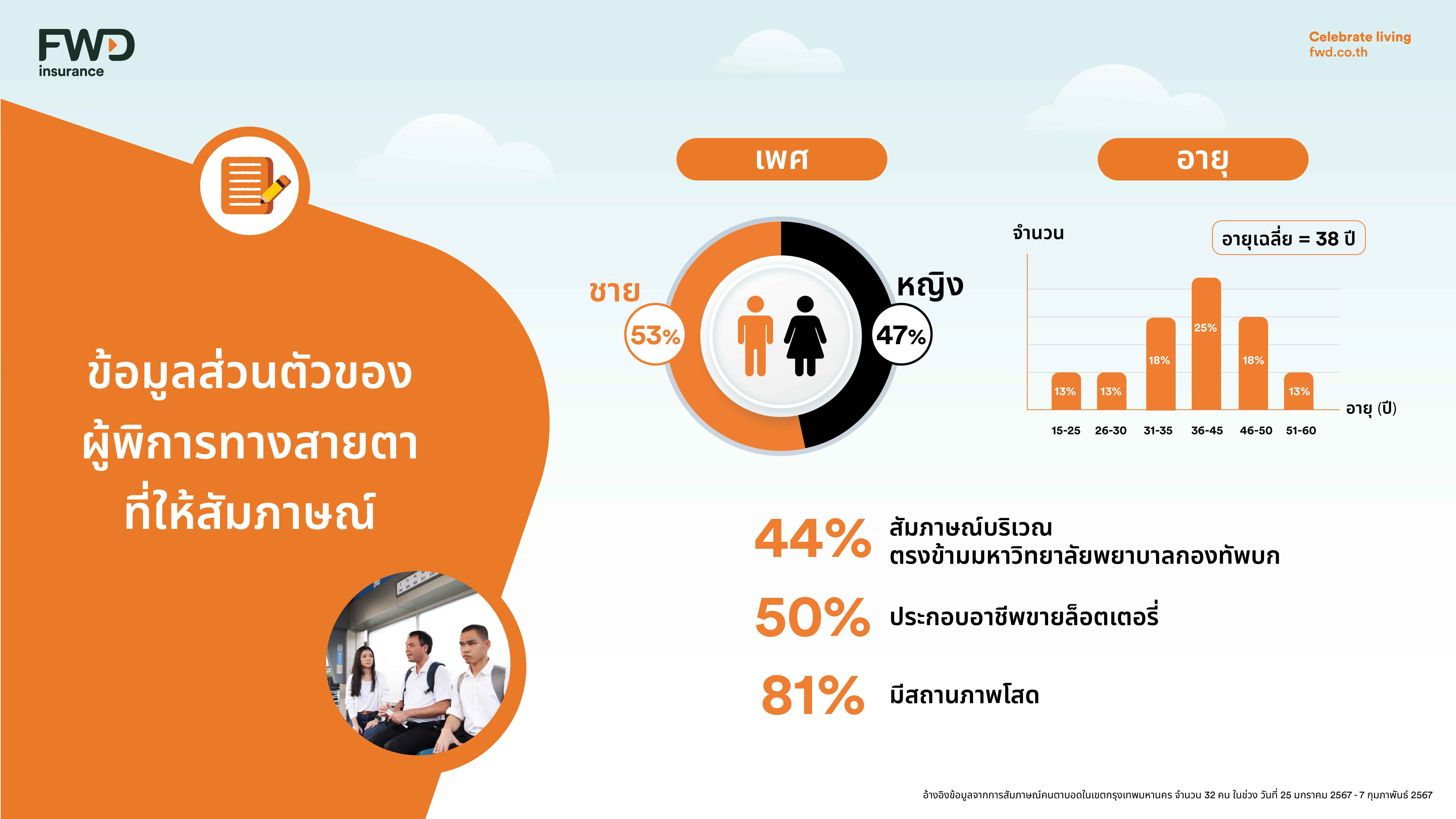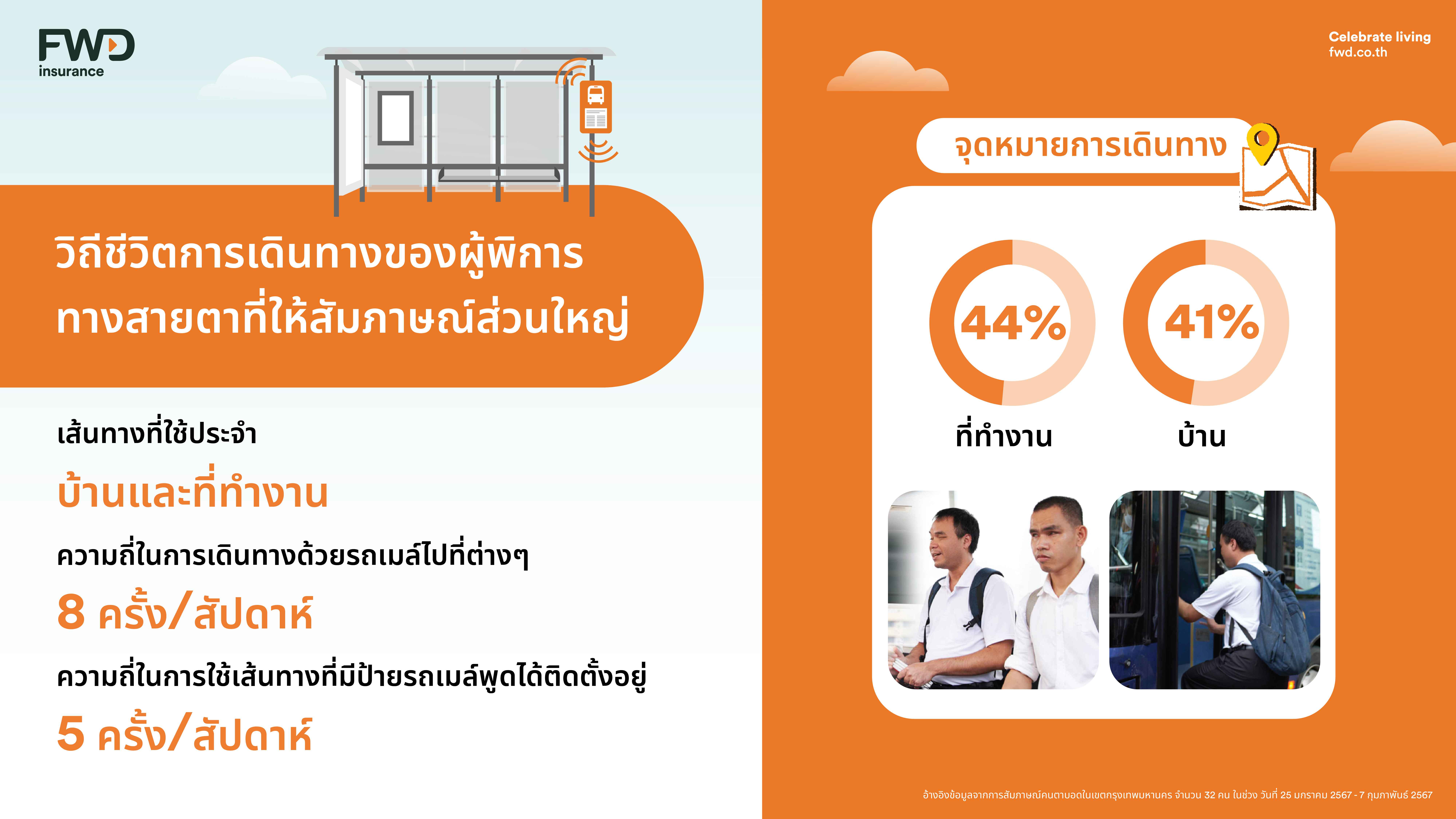 FWD ประกันชีวิต ได้ศึกษาข้อมูลจากรายงานสถานการณ์ด้านคนพิการทางการมองเห็นในประเทศไทย โดยกรมส่งเสริมและพัฒนาคุณภาพชีวิตคนพิการ กระทรวงการพัฒนาสังคมและความมั่นคงของมนุษย์ พบว่า ปัจจุบัน (ข้อมูล ณ วันที่ 31 มีนาคม 2566) ประเทศไทยมีผู้พิการทางสายตา จำนวน 184,622 คน ที่มีการเดินทางเป็นส่วนหนึ่งของชีวิตประจำวัน รวมกับข้อมูลจากการสัมภาษณ์เชิงลึก (in-depth interview) กับผู้พิการทางสายตาภายใต้การดูแลของมูลนิธิช่วยคนตาบอดแห่งประเทศไทย ทำให้เราพบว่า ผู้พิการทางสายตาส่วนใหญ่เลือกใช้การเดินทางประจำวันด้วยรถโดยสารประจำทาง แต่ paint point สำคัญคือ มักจะพลาดรถประจำทางสายที่ต้องการ เนื่องจากไม่สามารถรับรู้ถึงสายรถประจำทางที่ต้องการได้อย่างชัดเจน จนกระทั่งเมื่อแคมเปญได้นำร่องเปิดใช้งานอย่างเป็นทางการ ในช่วงปลายปีที่ผ่านมา บริเวณป้ายรถเมล์ที่ใกล้กับสถานที่ที่ผู้พิการทางสายตาใช้เป็นประจำ จำนวน 10 ป้ายรถเมล์ ครอบคลุมเส้นทางการเดินรถเมล์ 46 สาย ทาง FWD ประกันชีวิต จึงได้ร่วมกับ Homerun Consulting ที่ปรึกษาด้านการทำวิจัย ทำการวิจัยศึกษาอินไซต์และสัมภาษณ์เชิงลึกกลุ่มผู้พิการทางสายตาที่ใช้บริการรถเมล์ ทำให้พบว่า key finding ของ pain point ที่พบก่อนและหลังแคมเปญตรงกัน นอกจากนั้น ยังพบปัญหาสำคัญเพิ่มเติมซึ่งผู้พิการทางสายตาได้เล่าให้เราฟังว่าบางครั้ง รถเมล์ที่รอก็เข้าจอดไม่ตรงป้าย ยิ่งเวลาที่ไม่มีผู้โดยสารคนอื่นยืนรออยู่ด้วย ก็จะทำให้รถเมล์ไม่ได้เข้ามาจอด หรือในบางครั้งผู้พิการทางสายตาก็ไม่สามารถสอบถามหรือขอความช่วยเหลือจากใครได้ ดังนั้น การมีระบบเสียงอัจฉริยะที่ป้ายรถเมล์ ก็เป็นอีกหนึ่งตัวช่วยที่ดี เพื่อเตือนให้ผู้พิการทางสายตาทราบถึงรถโดยสารที่กำลังจะมา และเตรียมตัวเดินทาง