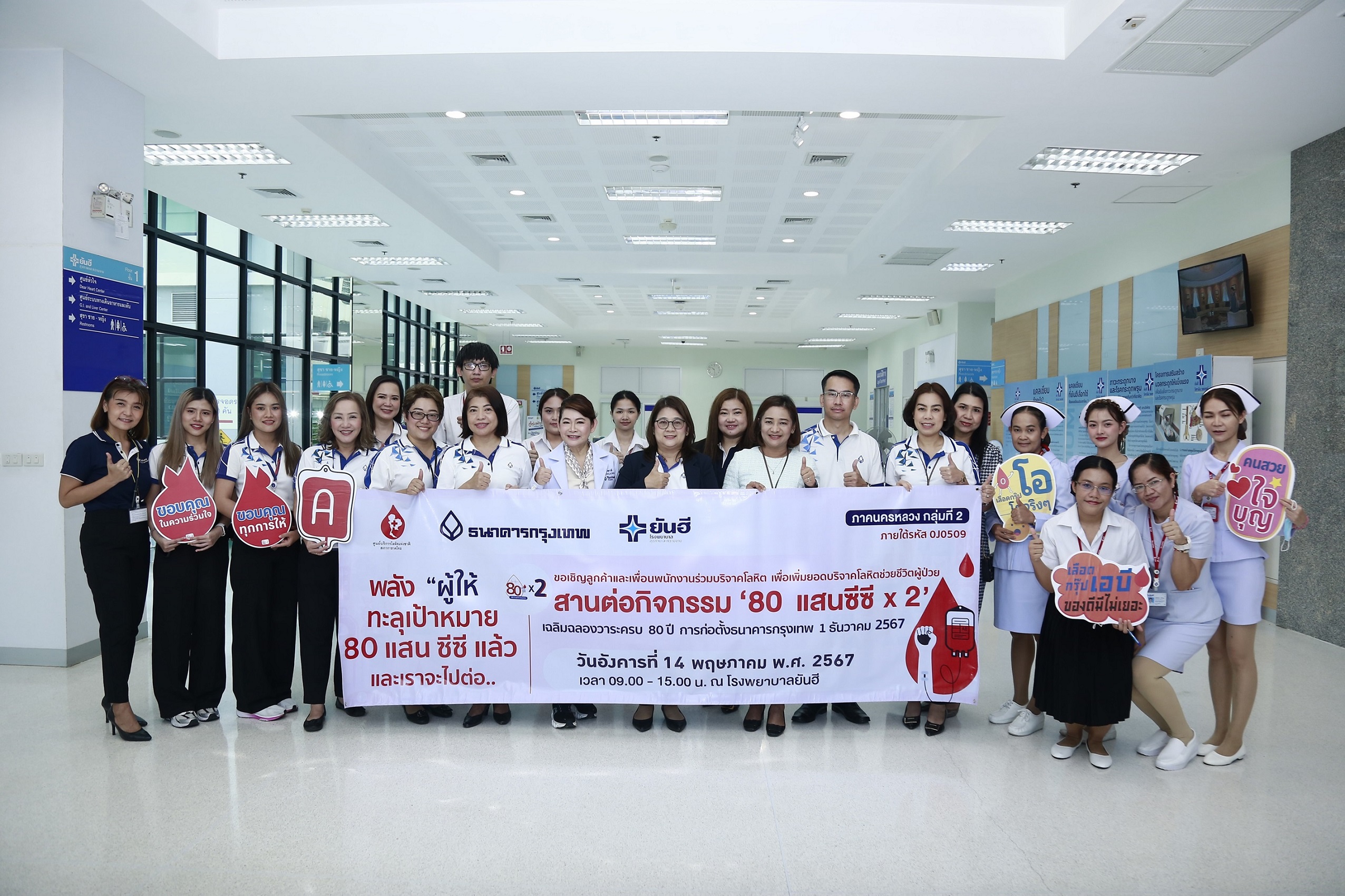 ธนาคารกรุงเทพ จำกัด(มหาชน) จับมือองค์กรพันธมิตรชั้นนำทั้งในพื้นที่กรุงเทพฯและส่วนภูมิภาค ลุยเพิ่มยอดรับบริจาคโลหิตใน “โครงการ 80 แสนซีซี 80 ปี ธนาคารกรุงเทพ” ล่าสุดดึงโรงพยาบาลยันฮี ร่วมกิจกรรมพร้อมเปิดจุดรับบริจาคตลอดทั้งปี มุ่งสู่เป้าหมาย “80 แสนซีซีx2” หวังเพิ่มปริมาณโลหิต บรรเทาสถานการณ์โลหิตสำรองขาดแคลนในปัจจุบัน