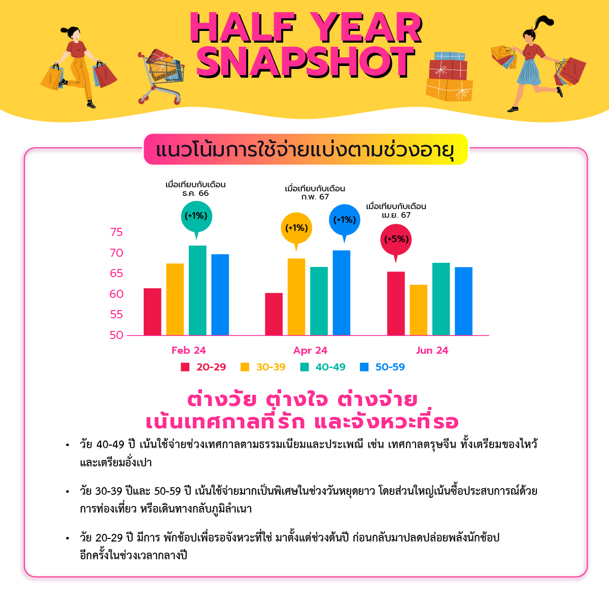 ภาพรวมครึ่งแรกของปีนี้ กลับมามีสีสันและคึกคักกว่าที่เคย ด้วยโอกาสที่เปิดกว้างมากยิ่งขึ้น ทำให้คนไทยสามารถเอ็นจอยกับประสบการณ์ใหม่ ๆ ได้มากขึ้น ไม่ว่าจะเป็น กางเกงช้าง ที่กลับมาฮิตติดกระแสจากการโปรโมทของรัฐบาล รวมไปถึงความฮอตของกระแส Art Toy ที่กำลังเป็นที่นิยมในวงกว้าง ยังรวมไปถึงประสบการณ์ความบันเทิงต่าง ๆ ทั้งจากศิลปินจากไทย เกาหลี และตะวันตก ที่มาจัดแสดงคอนเสิร์ตกันไว้เว้นแต่ละเดือน ส่งผลให้ภาพรวมค่าเฉลี่ยในการช้อปของคนไทยปรับตัวขึ้นมาเป็น 66 คะแนน ในขณะที่ช่วงเวลาเดียวกันของปีที่ผ่านมาอยู่ที่ 64 คะแนน