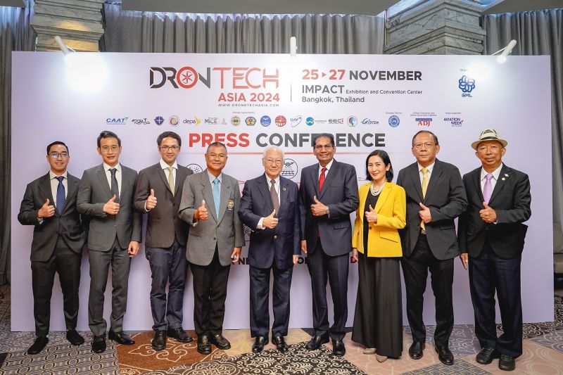 นายมนู เลียวไพโรจน์ (ที่ 5 จากขวา) ประธาน บริษัท จีเอ็มแอล เอ็กซิบิชั่น (ประเทศไทย) จำกัด ผนึกกำลังพันธมิตรภาครัฐและเอกชน จัดงานแถลงข่าว “บทบาทอุตสาหกรรมโดรนกับการขับเคลื่อนเศรษฐกิจไทยยุคดิจิทัล และเปิดตัวงาน “DronTech Asia 2024” งานนิทรรศการและการประชุมระดับนานาชาติ ครั้งแรกในประเทศไทยที่เกี่ยวข้องกับโดรนและเทคโนโลยี ณ ห้อง Altitude ชั้น 25 เดอะ เวสทิน แกรนด์ สุขุมวิท กรุงเทพฯ เมื่อเร็ว ๆ นี้