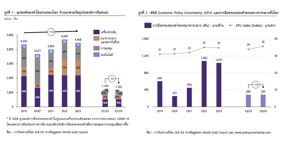 ของธนาคารกลาง โดยดัชนี Economic Policy Uncertainty (EPU) มีทิศทางเดียวกันกับการเข้าถือครองทองคำเพื่อเป็นทุนสำรองของธนาคารกลางทั่วโลก สะท้อนว่านอกจากทองคำจะเป็นทุนสำรองของประเทศแล้ว ทองคำยังเป็นเป็นสินทรัพย์ที่เป็นหลักประกันความมั่นคงทางเศรษฐกิจของประเทศท่ามกลางสถานการณ์ความไม่แน่นอนต่าง ๆ ดังเช่นในปี 2022 ที่เกิดสถานการณ์ความขัดแย้งระหว่างรัสเซียและยูเครน เป็นเหตุให้ราคาพลังงาน และเงินเฟ้อปรับตัวสูงขึ้นมาก ส่งผลให้การ