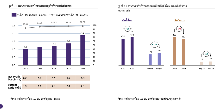 สำหรับผู้ค้าทองรายกลางและเล็กยังเผชิญความท้าทายด้านจำนวนฐานลูกค้า และความสามารถในการแข่งขันที่ยังต่ำกว่าผู้ค้าทองรายใหญ่อยู่มาก จนเริ่มเห็นการทยอยปิดกิจการ โดยพบว่า ในช่วง 4 เดือนแรกของปี 2024 จำนวนธุรกิจค้าทองจดทะเบียนเลิกกิจการเพิ่มขึ้น 5% เมื่อเทียบกับช่วงเดียวกันของปีก่อน โดยส่วนใหญ่เป็นผู้ค้าทองขนาดเล็ก ที่มีทุนจดทะเบียนไม่เกิน 3 ล้านบาท อย่างไรก็ดี จากรายได้โดยรวมของธุรกิจค้าทองในไทยที่ขยายตัวอย่างต่อเนื่อง ส่งผลให้ธุรกิจค้าทองยังได้รับความสนใจในการประกอบกิจการ สะท้อนจากจำนวนธุรกิจค้าทองจดทะเบียนจัดตั้งใหม่ที่ขยายตัวในปี 2023 และในช่วง 4 เดือนแรกของปี 2024 ก็ยังขยายตัวต่อเนื่องที่ 12% เมื่อเทียบกับช่วงเดียวกันของปีก่อน