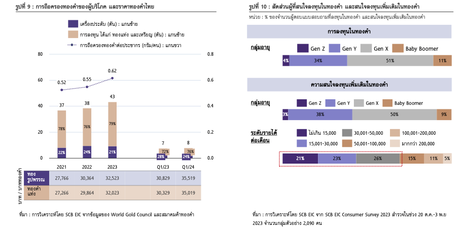 ทั้งนี้ ผลสำรวจ SCB EIC Consumer survey 2023 พบว่า กลุ่มที่มีการลงทุนในทองคำมากที่สุด คือ กลุ่ม Gen X คิดเป็นสัดส่วน 51% รองลงมาเป็นกลุ่ม Gen Y คิดเป็นสัดส่วน 34% อีกทั้งกลุ่ม Gen X และ Y ยังมีสัดส่วนผู้ที่สนใจลงทุนเพิ่มเติมในทองคำสูงกว่า Gen อื่น ๆ อีกด้วย สะท้อนฐานนักลงทุนกลุ่ม Gen X และ Y ที่ยังเป็นกลุ่มหลักที่ลงทุนในทองคำอย่างต่อเนื่อง อีกทั้งเมื่อพิจารณากลุ่มที่สนใจลงทุนเพิ่มเติมในทองคำ จำแนกตามระดับรายได้ จะพบว่า กลุ่มที่มีรายได้ระดับ 50,000 บาท/เดือนลงมา สนใจลงทุนเพิ่มเติมในทองคำ เป็นโอกาสให้ผู้ค้าทองอาจขยายฐานนักลงทุนกลุ่มดังกล่าว ด้วยการมุ่งเน้นการนำเสนอบริการลงทุนในทองคำที่ตอบโจทย์กลุ่มที่มีรายได้ระดับปานกลางลงมา อย่างการเปิดบัญชีจำหน่ายทองคำในหน่วยย่อย เพื่อให้ผู้ลงทุนที่มีรายได้ระดับปานกลางลงมาสามารถทยอยลงทุนได้อย่างเหมาะสมตามระดับเงินออม และสะสมรับเป็นทองคำได้เมื่อถึงน้ำหนักที่กำหนด