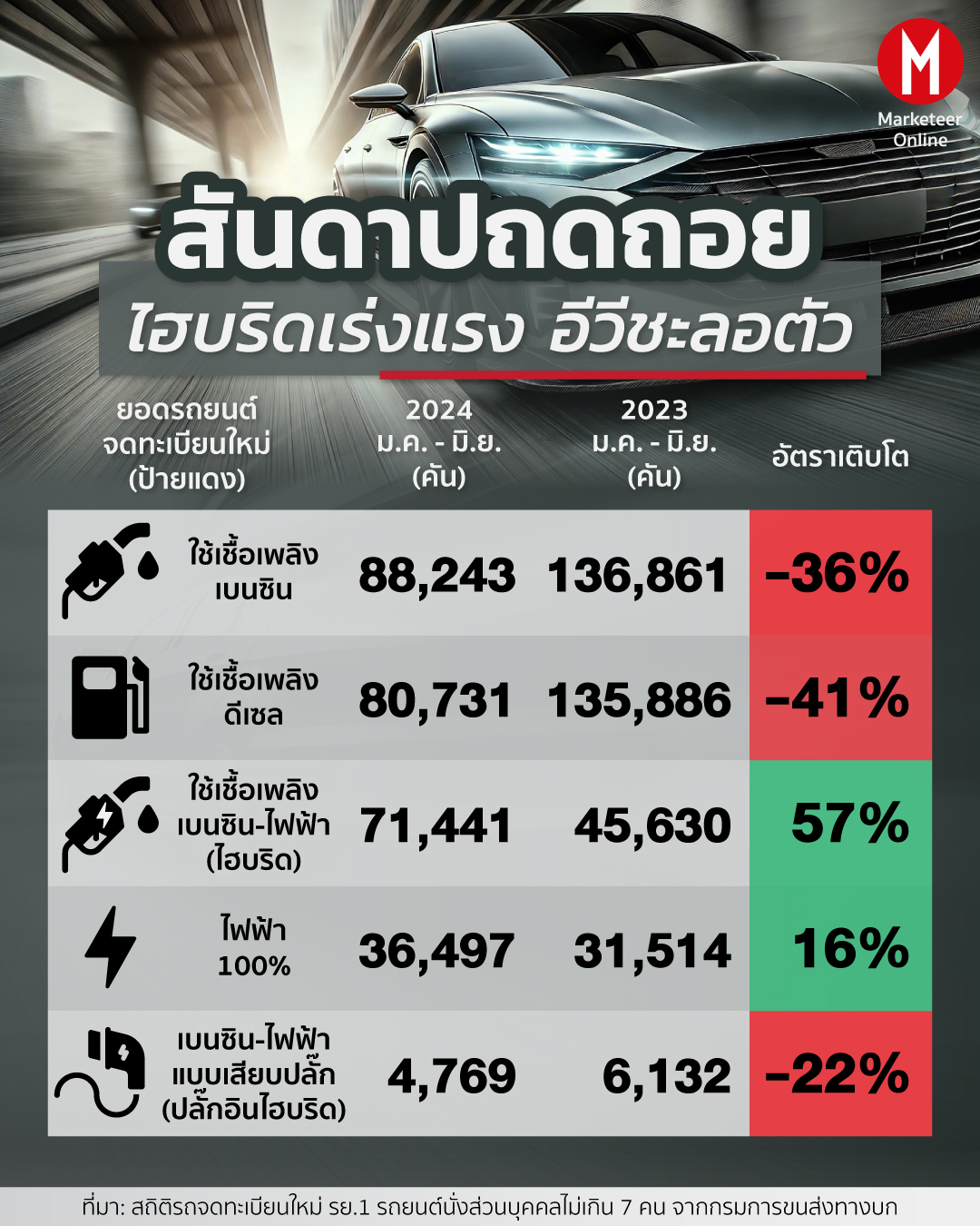 | ยอดจดทะเบียนใหม่ (ป้ายแดง) | ม.ค – มิ.ย. 2024 (คัน) | ม.ค – มิ.ย. 2023 (คัน) | อัตราเติบโต |