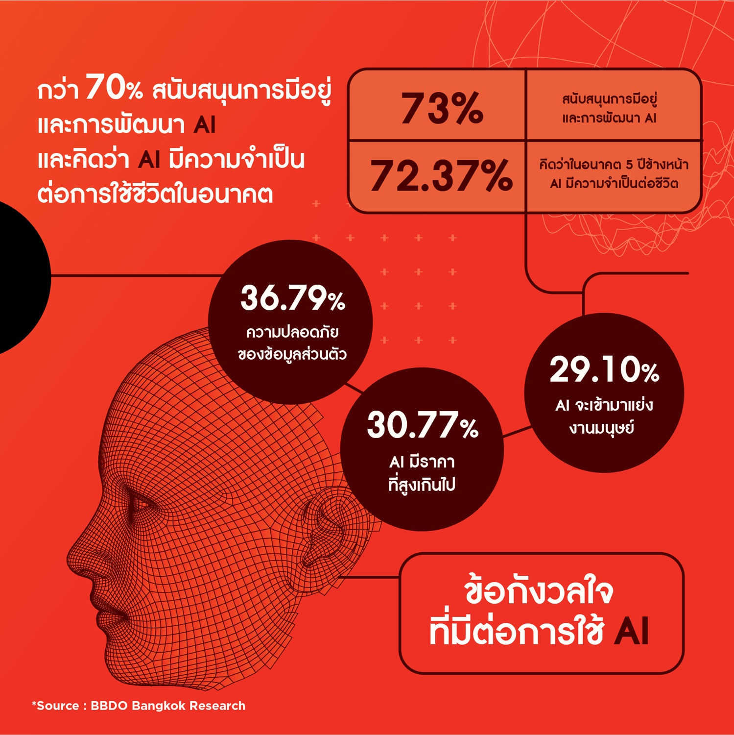 ในยุคที่กระแส AI มาแรงสุดๆ และเข้ามาเปลี่ยนชีวิตประจำวันของเราให้ล้ำไปอีกขั้น BBDO Bangkok เผยผลสำรวจเจาะลึกความคิดเห็นผู้บริโภคไทยและพฤติกรรมการใช้ AI จากกลุ่มตัวอย่างกว่า 400 คนในกรุงเทพและหัวเมืองหลักๆ ทั่วประเทศ ซึ่งแสดงให้เห็นถึงความคิด ความเข้าใจที่มีต่อ AI และพฤติกรรมการนำ AI มาใช้ในชีวิตประจำวันของคนไทยในปัจจุบัน