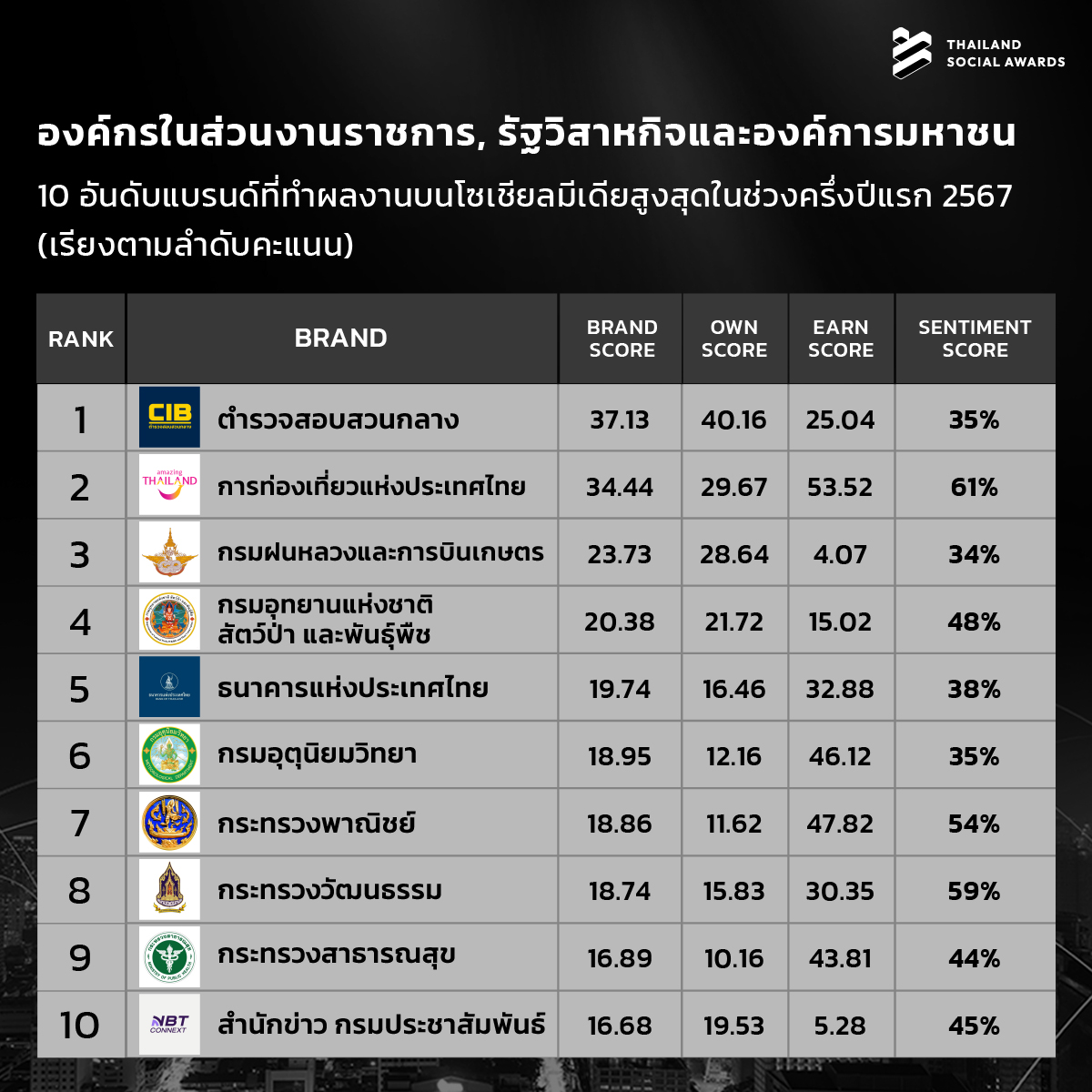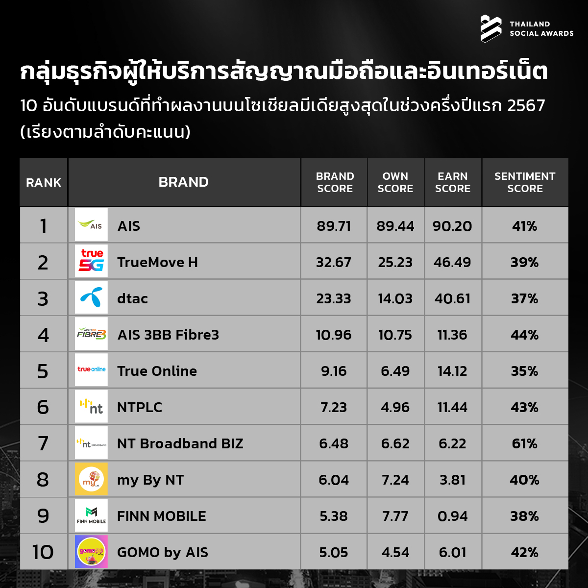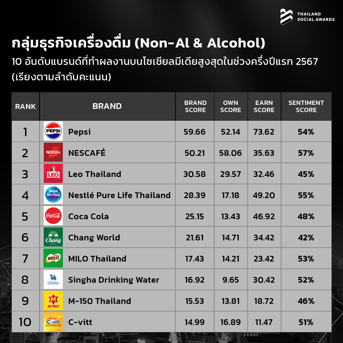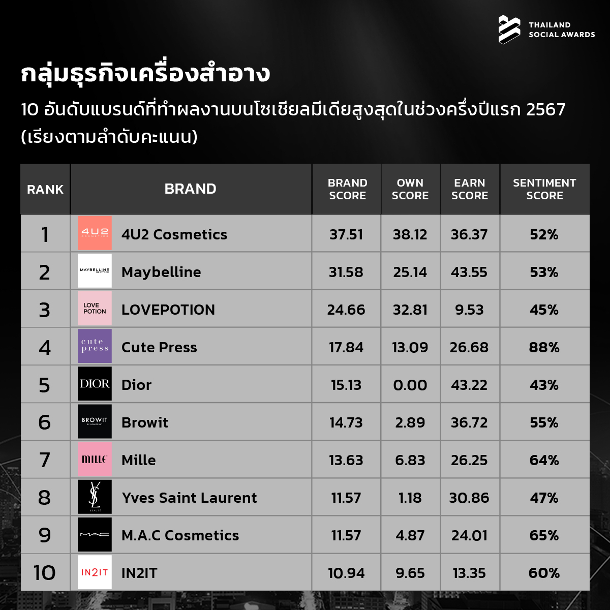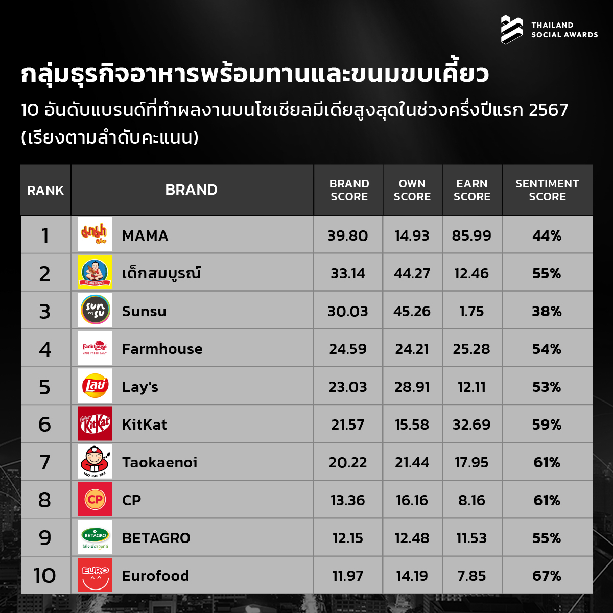 รายชื่อ 10 อันดับแบรนด์ใน 31 กลุ่มธุรกิจที่ทำผลงานบนโซเชียลมีเดียสูงสุดในช่วงครึ่งปี 2567 (เรียงลำดับตามคะแนน)
