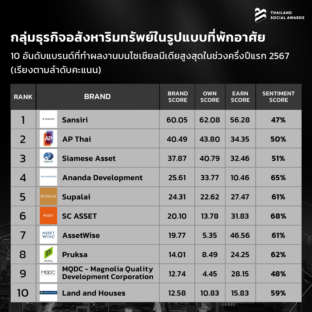 - กลุ่มธุรกิจอสังหาริมทรัพย์ในรูปแบบที่พักอาศัย ได้แก่ Sansiri, AP Thai, Siamese Asset, Ananda Development, Supalai, SC ASSET, AssetWise, Pruksa, MQDC – Magnolia Quality Development Corporation, Land and Houses