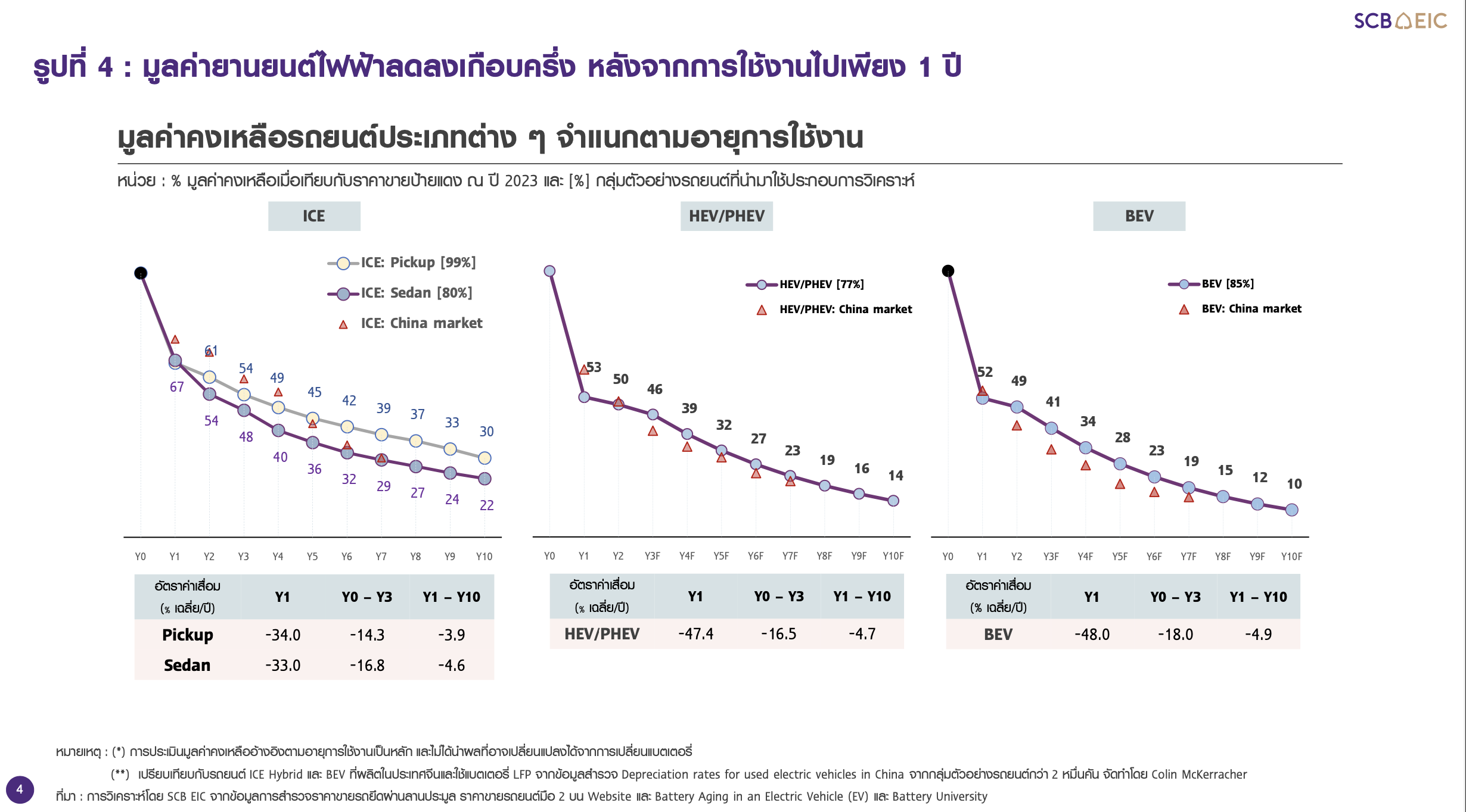 อย่างไรก็ดี SCE EIC ตระหนักถึงความท้าท้ายดังกล่าว จึงได้ศึกษาแนวโน้มการเสื่อมราคาของยานยนต์แต่ละประเภทผ่านการวิเคราะห์ 1) ข้อมูลราคาขายรถยนต์มือ 2 บนเว็บไซต์ต่าง ๆ อาทิ One2car.com TaladRod.com และ Carsome.co.th 2) ข้อมูลเชิงลึกจากสมาคมธุรกิจเช่าซื้อไทยและธุรกิจรับประมูลรถยนต์ และ 3) งานศึกษาต่างประเทศที่ประเมินอัตราการเสื่อมของแบตเตอรี่ยานยนต์ไฟฟ้า ราคาขายรถมือ 2 และระดับการแข่งขัน