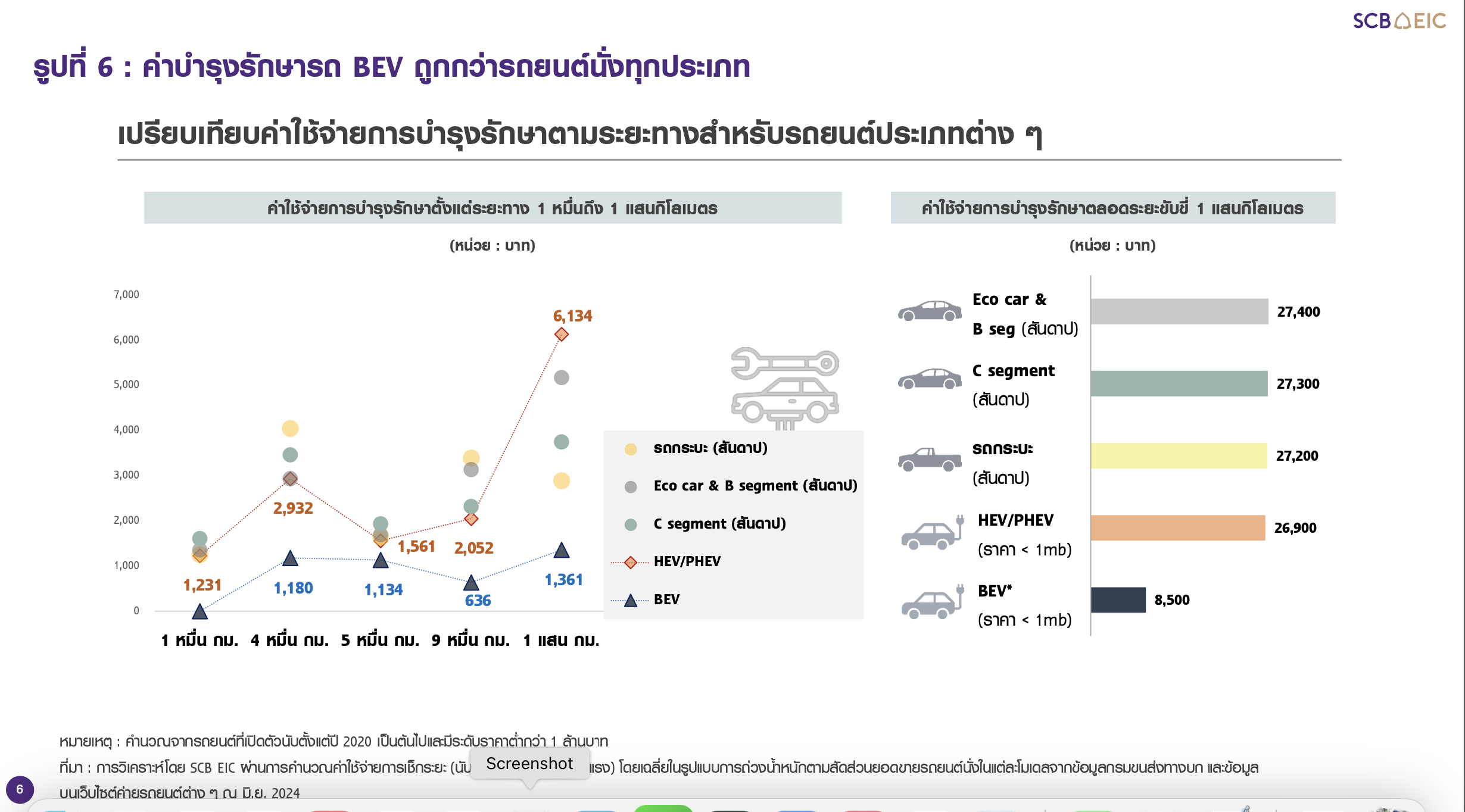 อนึ่ง ค่าใช้จ่ายในการเช็กระยะ นอกจากจะผันแปรไปตามเวลาและระยะการใช้งานแล้ว ยังขึ้นอยู่กับจำนวนชิ้นส่วนรถยนต์ที่จำเป็นต้องได้รับการดูแล ด้วยเหตุนี้ รถ BEV ซึ่งประกอบด้วยชิ้นส่วนหลักเพียงแค่ 7 ชิ้น[15] จึงมีต้นทุนการบำรุงรักษาที่ต่ำกว่ารถประเภทอื่น ๆ หรืออยู่ที่ 8.5 พันบาทจากการใช้งานทั้งสิ้น 1 แสนกิโลเมตร (ประมาณ 5 ปี) (รูปที่ 6) โดยการซ่อมบำรุงหลัก ๆ จะเกี่ยวข้องกับระบบปรับอากาศ ระบบน้ำมันเบรก และระบบเกียร์ ขณะที่รถสันดาปและไฮบริดมีค่าใช้จ่ายการบำรุงรักษาใกล้เคียงกันที่ 2.7 หมื่นบาท โดยต้นทุนบางส่วนจะเกี่ยวข้องกับระบบส่งกำลัง อีกทั้ง อัตราค่าแรงก็ปรับเพิ่มขึ้นตามจำนวนอะไหล่ยนต์ที่ต้องได้รับการตรวจเช็กและซ่อมบำรุงในแต่ละรอบอีกด้วย