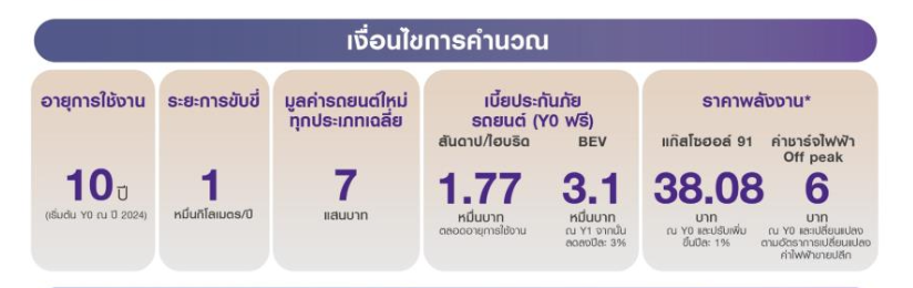 [14] กำหนดใช้ราคาพลังงานคงที่ตลอดอายุการใช้งาน 1 ปี ทั้งแก๊สโซฮอล์ 91 และค่าชาร์จไฟฟ้าช่วง Off peak อ้างอิง ณ วันที่ 22 มิ.ย. 2024
