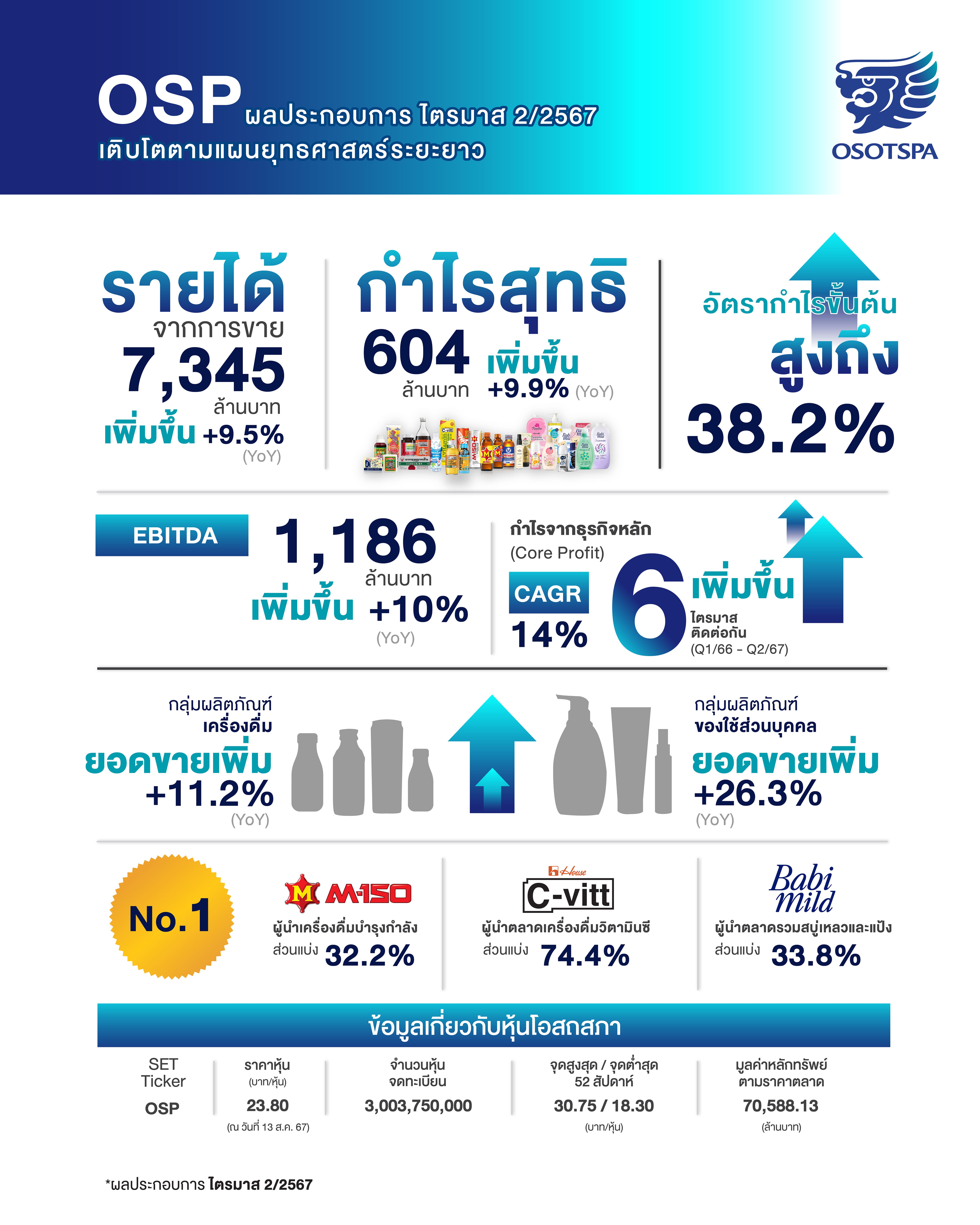 ‘บมจ. โอสถสภา (OSP)’ โชว์ผลการดำเนินงานไตรมาส 2/2567 เติบโตทั้งยอดขายและกำไรสุทธิ ทั้งธุรกิจเครื่องดื่มและผลิตภัณฑ์ของใช้ส่วนบุคคล ทำยอดขายพุ่งทั้งในประเทศและต่างประเทศ มีรายได้จากการขายรวม 7,345 ล้านบาท เพิ่มขึ้น 9.5% (YoY) และเพิ่มขึ้น 1.2% (QoQ) ผลักดันโดยการเติบโตของกลุ่มผลิตภัณฑ์เครื่องดื่มที่ 11.2% (YoY) และ 0.4% (QoQ) โดยมีแบรนด์ ‘เอ็ม-150’ ครองแชมป์อันดับ 1 อย่างต่อเนื่อง และแบรนด์ ‘ซี–วิท’ ผู้นำตลาดเครื่องดื่มฟังก์ชันนัลดริงก์ที่โตเด่นทิ้งห่างคู่แข่ง ควบคู่กับกลยุทธ์เพิ่มมูลค่าผลิตภัณฑ์และบริหารจัดการต้นทุนการผลิตที่มีประสิทธิภาพ รวมถึงการเติบโตของผลิตภัณฑ์ของใช้ส่วนบุคคลที่เพิ่มขึ้นที่ 26.3% (YoY) และ 18.2% (QoQ) โดยบริษัทฯ รายงานกำไรสุทธิที่ 604 ล้านบาท เติบโต 9.9% (YoY) เป็นกำไรจากการดำเนินงานปกติ (Profit from Operation) อยู่ที่ 923 ล้านบาท เติบโต 68.0% YoY และ 11.4% QoQ เป็นผลมาจากการเพิ่มประสิทธิภาพในการบริหารต้นทุนและการดำเนินงานอย่างต่อเนื่อง รวมถึงการที่บริษัทฯ มีการนำเสนอผลิตภัณฑ์ใหม่ๆ เพื่อตอบสนองความต้องการของลูกค้าและขยายฐานลูกค้ากลุ่มใหม่ ทั้งนี้ บริษัทฯ มีผลขาดทุนจากรายการที่ไม่ใช่การดำเนินงานปกติสำหรับไตรมาสนี้จากการด้อยค่าเงินลงทุนในบริษัท Basecamp Brews Limited (BCB) จำนวน 315 ล้านบาท และการตั้งสำรองเงินให้กู้ยืมของบริษัท อินโนเวชั่น ออฟ เอ็กซ์พีเรียนซ์ จํากัด (iEX) จำนวน 4 ล้านบาท ในส่วนของผลการดำเนินงานครึ่งปีแรกของปี 2567 บริษัทฯ รายงานกำไรสุทธิ 1,433 ล้านบาท เติบโต 7.9% YoY และประกาศจ่ายเงินปันผลในอัตรา 0.30 บาทต่อหุ้น พร้อมเดินหน้าผลักดันการเติบโตตามแผนยุทธศาสตร์ระยะยาว