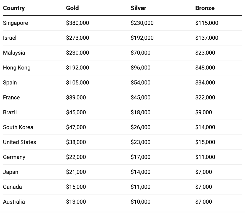 เงินอัดฉีดที่แต่ละประเทศมอบให้นักกีฬาเมื่อได้เหรียญแต่ละประเภท: CNBC