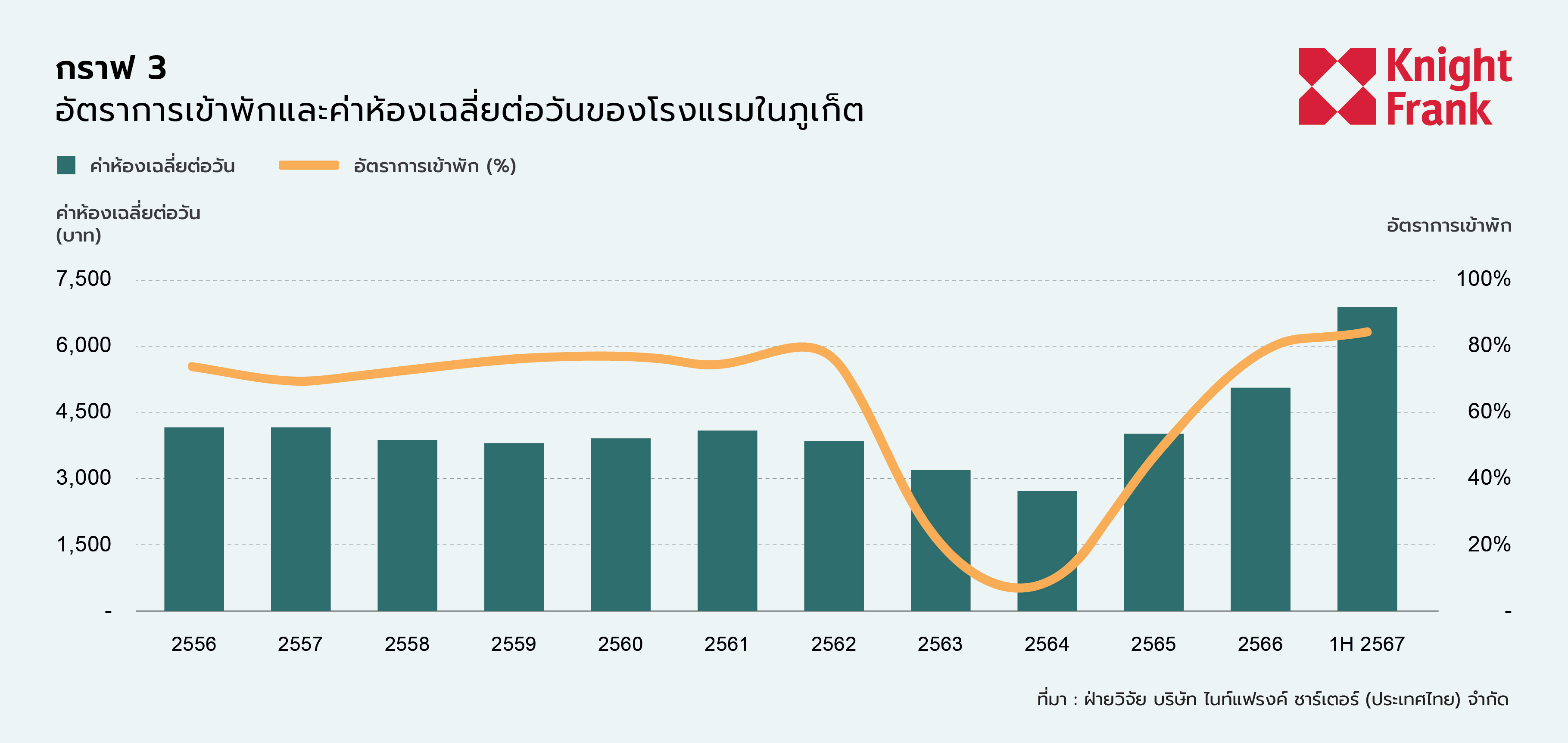 อุตสาหกรรมการท่องเที่ยวของภูเก็ตแสดงถึงการฟื้นตัวที่แข็งแกร่งในครึ่งปีแรกของปี 2024 โดยมีจำนวนนักท่องเที่ยวรวมถึง 4.3 ล้านคน ต่ำกว่าระดับก่อนเกิดโรคระบาดเพียง 7% จำนวนนักท่องเที่ยวต่างชาติพุ่งสูงขึ้นถึง 2.6 ล้านคน ปรับตัวเพิ่มขึ้นกว่า 42% เมื่อเทียบกับปีต่อปี ซึ่งใกล้เคียงกับตัวเลขก่อนเกิดโรคระบาด คาร์ลอส มาร์ติเนซ ผู้อำนวยการฝ่ายวิจัยและที่ปรึกษาของ Knight Frank เน้นย้ำว่า “การปรับปรุงความสามารถในการขนส่งทางอากาศคาดว่าจะช่วยส่งเสริมการเติบโตต่อไปในครึ่งปีหลัง”