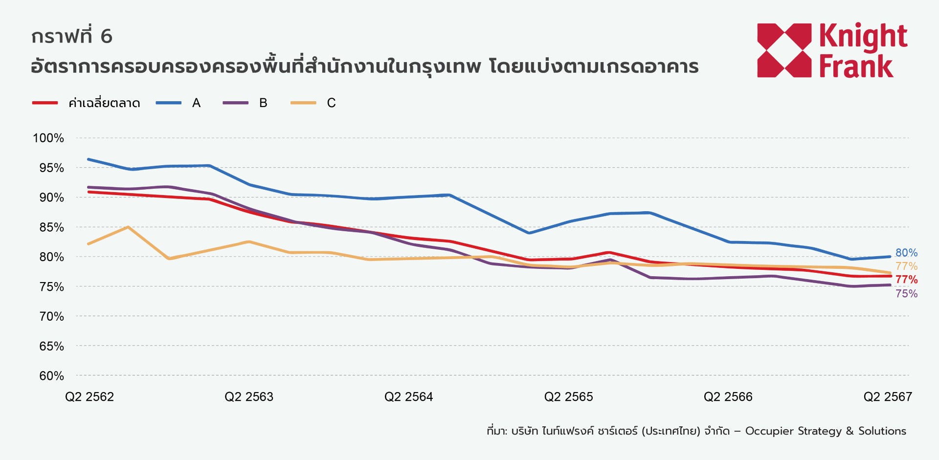 อัตราการครอบครองตลาดโดยรวมทรงตัวที่ 77% สอดคล้องกับไตรมาสก่อน สำนักงานเกรด A มีเสถียรภาพมากที่สุด อัตราการครอบครองสูงสุดที่ 80% แม้ว่าจะลดลง 2.5% เมื่อเทียบปีต่อปี เนื่องจากแรงกดดันอย่างต่อเนื่องของอุปทาน เกรด B เพิ่มขึ้นเล็กน้อย 0.3% ในขณะที่เกรด C ลดลง 1% เหลือ 77%