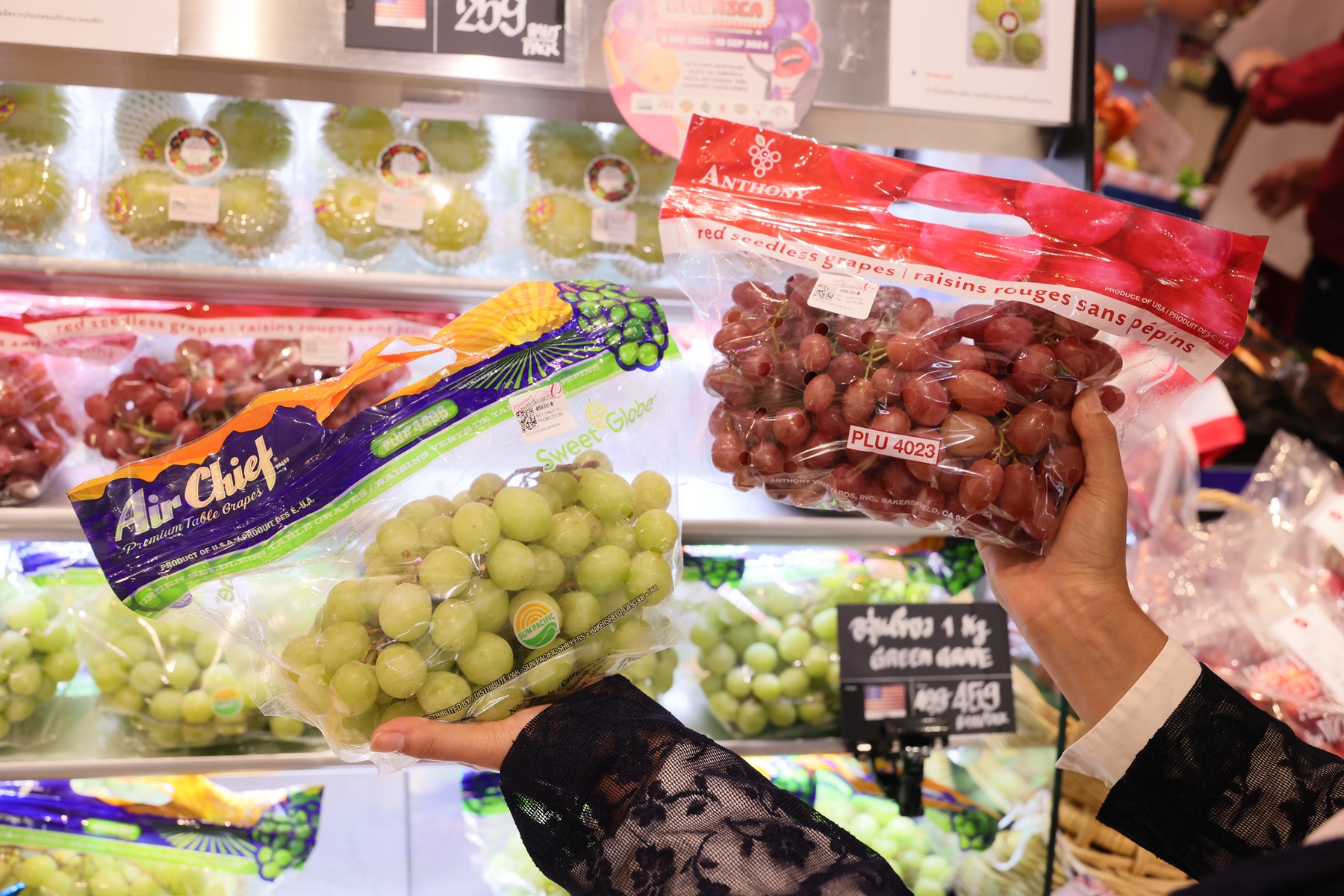 - โซนผัก- ผลไม้นำเข้า อาทิ แอปเปิ้ลวอชิงตัน สายพันธุ์ Cosmic Crisp รสชาติ หวานซ่อนเปรี้ยว เนื้อแอปเปิลจะไม่เปลี่ยนสีแม้หั่นไว้เป็นเวลาหลายชั่วโมง รวมไปถึง องุ่นเขียว องุ่นแดง เบบี้แครอท
