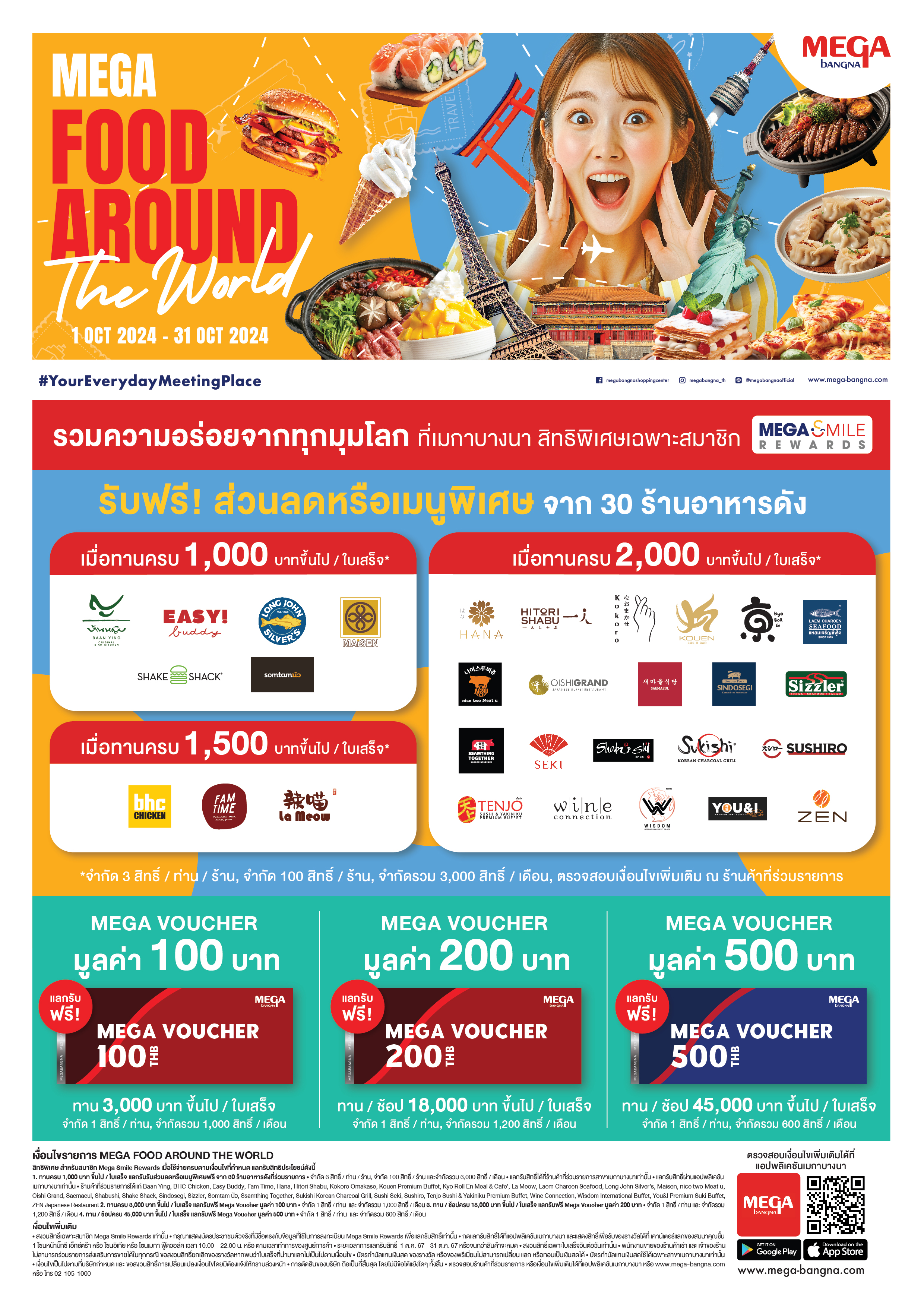 ศูนย์การค้าเมกาบางนา ตอกย้ำความเป็น FOOD DESTINATION ที่ดีที่สุด ตอบโจทย์ทุกไลฟ์สไตล์ด้วยร้านอาหารหลากหลายสัญชาติที่มีมากกว่า 180 ร้าน มอบโปรโมชั่นพิเศษที่มีเฉพาะที่นี้เท่านั้น ด้วยแคมเปญ MEGA FOOD AROUND THE WORLD รวมความอร่อยจากทุกมุมโลก เสิร์ฟพร้อมดีลสุดเอ็กซ์คลูซีฟจาก 30 ร้านอาหารชื่อดัง เฉพาะสมาชิกเมกา สไมล์ รีวอร์ดส รับฟรี! ส่วนลดหรือเมนูพิเศษจากร้านที่ร่วมรายการ และเมื่อรับประทานอาหารหรือช้อปครบตามเงื่อนไข แลกรับฟรี MEGA VOUCHER มูลค่ารวมสูงสุด 800 บาท พร้อมแลกรับเครดิตเงินคืนได้สูงสุดถึง 15% เมื่อใช้จ่ายผ่านบัตรเครดิตที่ร่วมรายการ ตลอดเดือนตุลาคมนี้