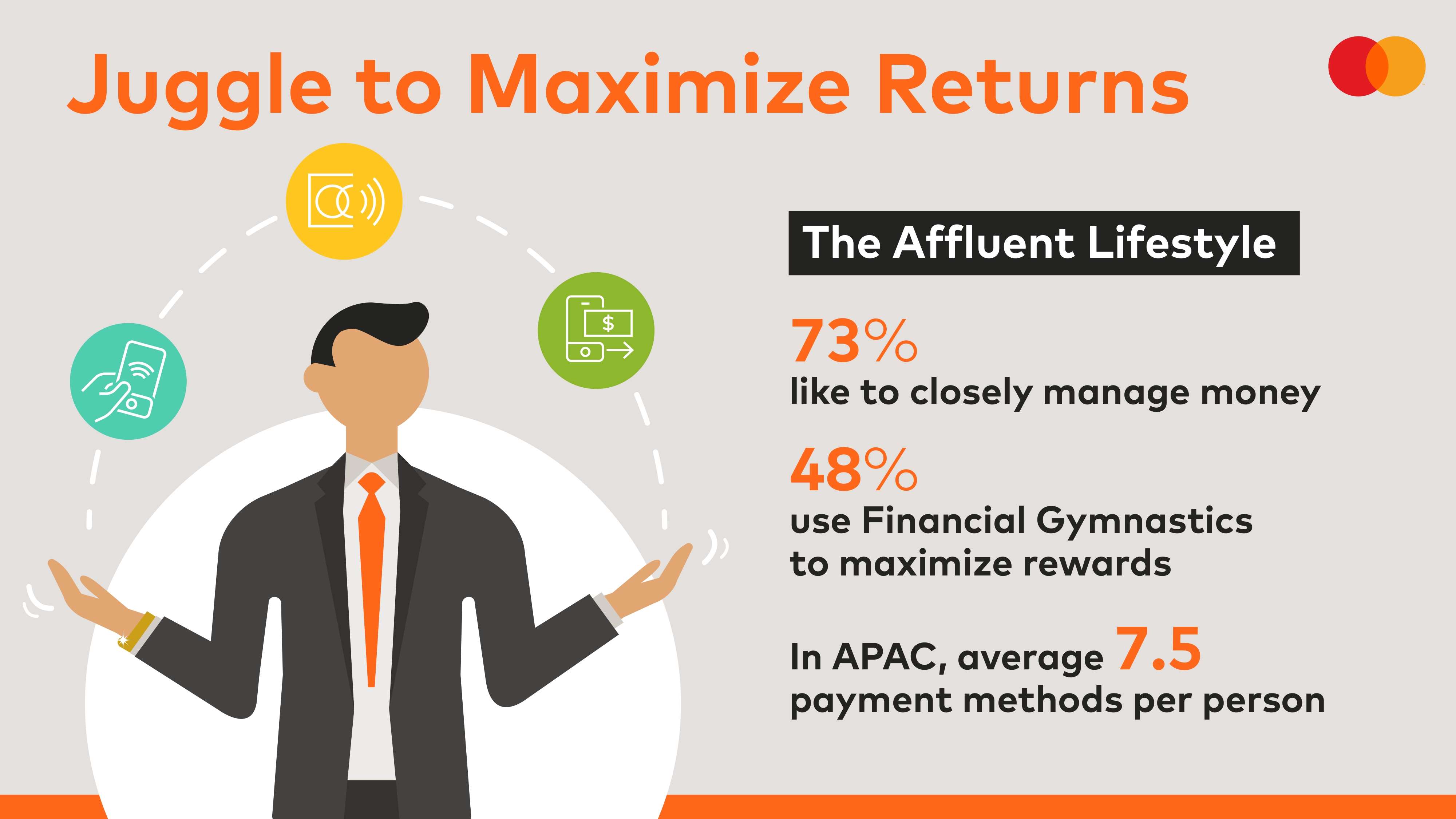 มาสเตอร์การ์ดเปิดเผยว่า 73% ของผู้บริโภคกลุ่มที่มีกำลังซื้อสูงมักนิยมบริหารจัดการเงินของตนเองอย่างชาญฉลาด โดย 48% ใช้เทคนิค Financial Gymnastics หรือการใช้กลยุทธ์การเงินขั้นสูงเพื่อให้ได้ผลลัพธ์สูงสุด