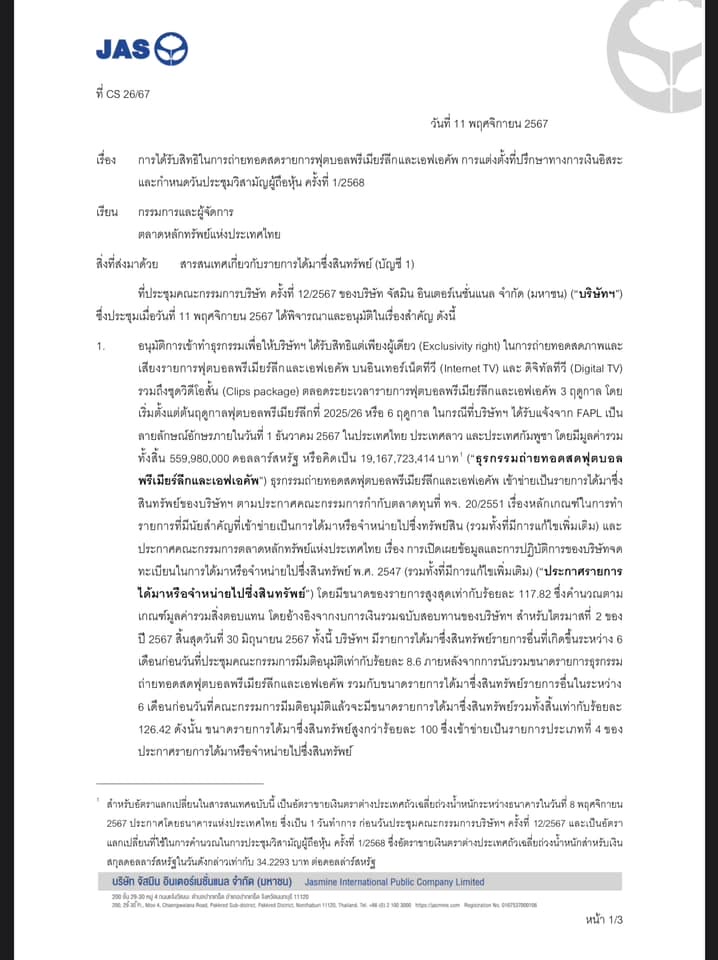บริษัท จัสมิน อินเตอร์เนชั่นแนล จำกัด (มหาชน) หรือ JAS แจ้งตลาดหลักทรัพย์ฯ คณะกรรมการบริษัทได้อนุมัติการเข้าทำธุรกรรมเพื่อให้บริษัทได้รับสิทธิ์แต่เพียงผู้เดียว (Exclusivity right) ในการถ่ายทอดสดภาพและเสียงรายการฟุตบอลพรีเมียร์ลีกและเอฟเอคัพ บนอินเทอร์เน็ตทีวี (Internet TV) และ ดิจิทัลทีวี (Digital TV) รวมถึงชุดวิดีโอสั้น (Clips package) ตลอดระยะเวลารายการฟุตบอลพรีเมียร์ลีกและเอฟเอคัพ 3 ฤดูกาล