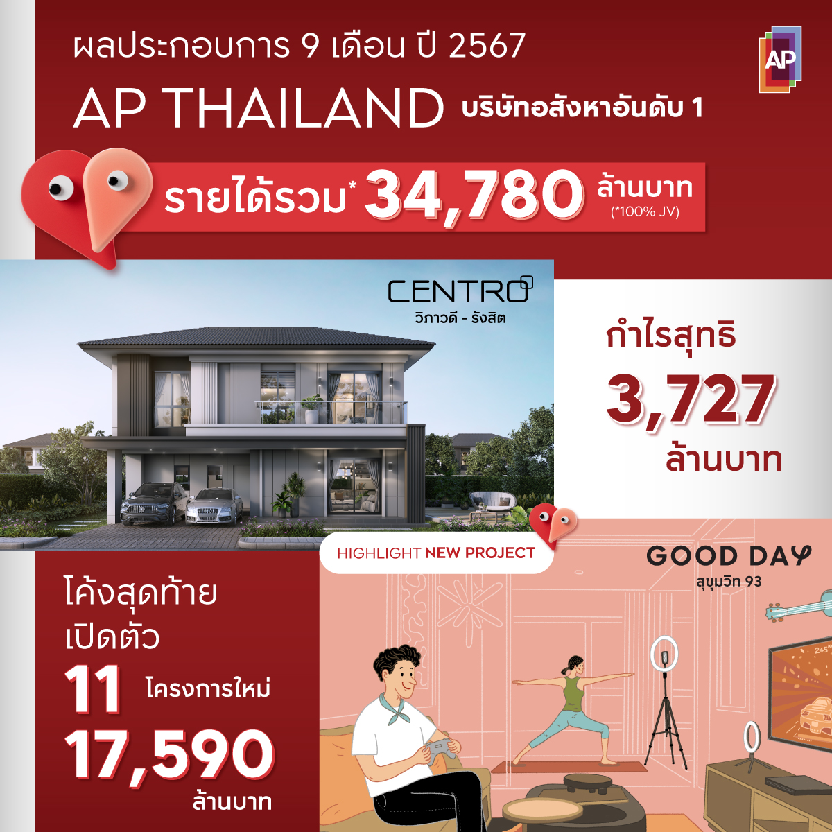 ขณะที่เฉพาะไตรมาส 3 ปี 2567 เอพีมีรายได้รวม (100% JV) 13,650 ล้านบาท เติบโตขึ้น 18% และกำไรสุทธิ 1,450 ล้านบาท เพิ่มขึ้นกว่า 14% จากไตรมาสก่อนหน้า