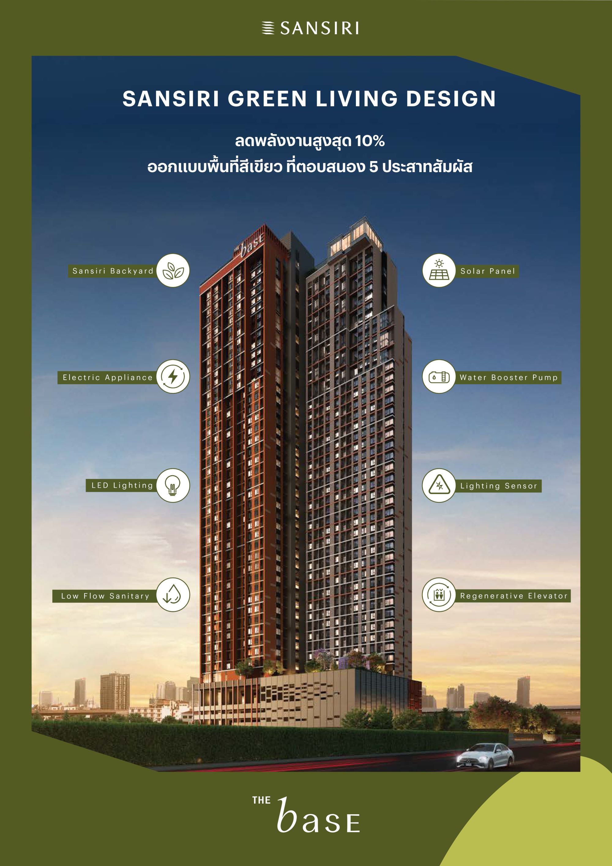 หลังจากแสนสิริเดินหน้ามอบบ้านสีเขียวให้กับลูกบ้านในโครงการเศรษฐสิริกว่า 10 โครงการ ในปี 2023 ล่าสุด ลุยต่อยอดความสำเร็จสู่การพัฒนาบ้านแนวคิดที่ยั่งยืนในเซ็กเม็นต์อื่นๆ อาทิ นาราสิริ, ณรินสิริ, บูก้าน, เศรษฐสิริ และ เอลซ์ รวมถึงขยายผลสู่คอนโดมิเนียมแบรนด์เดอะเบส (THE BASE) นำร่องที่ เดอะ เบส วงศ์สว่าง เป็นที่แรก โดยมีกลไกลหลักสำคัญที่ใช้ในการส่งมอบบ้านที่ยั่งยืน คือ 3 Green Framework ได้แก่ 1. Green Procurement คือ การเลือกใช้วัสดุ Green Product และเลือกคู่ค้าที่ใส่ใจกระบวนการผลิตที่ยั่งยืน 2. Green Construction ที่มีขั้นตอนและเลือกใช้วัสดุก่อสร้างที่เป็นมิตรต่อโลก 3. Green Architecture & Design หรือนวัตกรรมการออกแบบที่อยู่อาศัยเพื่อการใช้ชีวิตอย่างยั่งยืน สร้างสิ่งแวดล้อมที่เป็นมิตรต่อสุขภาพ โดยการต่อยอดดำเนินการบ้านแนวคิดที่ยั่งยืนนี้ มอบประสบการณ์การใช้ชีวิตอย่างมีคุณภาพ ผ่าน 2 แกนหลัก ได้แก่ Energy Saving ประหยัดพลังงานแบบจัดเต็ม ผ่านแนวคิดการออกแบบ Sansiri Green living Design และการเลือกวัสดุและอุปกรณ์ติดตั้ง Features ที่ช่วยลดการใช้พลังงาน ซึ่งทำให้โครงการจากแสนสิริสามารถลดการใช้พลังงานสูงสุดถึง 42% จากโครงการบ้าน (ณรินสิริ) และ 10% จากโครงการคอนโดมิเนียม (THE BASE) ที่จะช่วยลูกบ้านประหยัดค่าไฟในระยะยาว และมากไปกว่าเรื่องการลดพลังงาน คือพื้นที่สีเขียว หรือ “Green Space” คืนความเขียวฉ่ำให้ชีวิตได้สดชื่นในทุกวัน ผ่านแนวคิดการออกแบบไม่ว่าจะเป็น การนำต้นไม้ใหญ่ และพื้นที่สีเขียวมาผสานให้เข้ากับการอยู่อาศัย ทั้งในส่วนกลางและบริเวณบ้าน ที่พร้อมให้ทุกคนได้ใช้เวลาร่วมกันมากขึ้น โดยมีแนวคิด LIVING-WELLที่ทำให้ผู้อยู่อาศัยมีสุขภาพดีทั้งกายและใจ ส่งผลให้มีพื้นที่สีเขียวเพิ่มสูงกว่า 4 เท่าจากมาตรฐาน ในโครงการแนวราบ และ 35% ของที่ดินโครงการแนวสูงตามมาตรฐาน