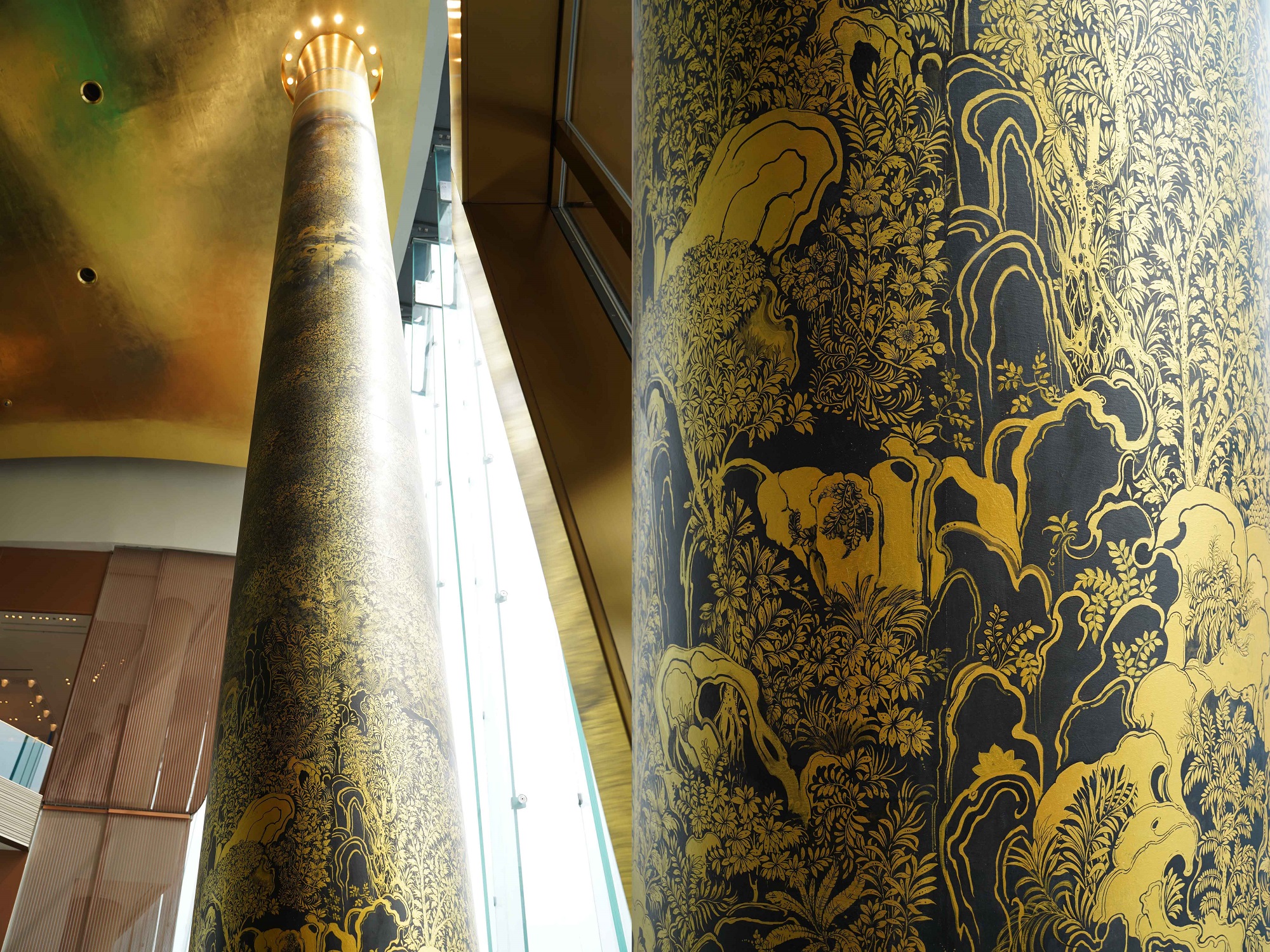 - ลวดลายพิมพ์ใบไม้ผ่าน “เสาแห่งมงคล” สีทองสุกสกาว ทองอร่ามทั้ง 8 ต้น สร้างสรรค์โดยศาสตราจารย์ถาวร ไกอุดมวิทย์ ศิลปินไทยที่มีชื่อเสียงระดับนานาชาติ