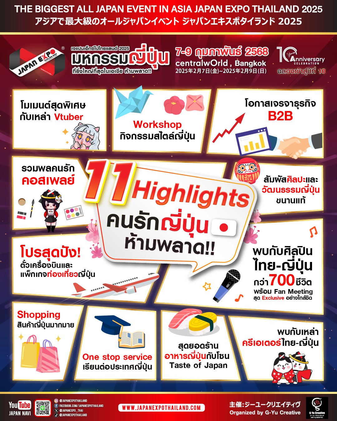 JAPAN EXPO THAILAND 2025 Celebrate 10th Anniversary ฉลองมิตรภาพอันเป็นนิจนิรันดร์ที่ไม่มีวันสิ้นสุด จัดเต็มความบันเทิงทุกรูปแบบ โดยเฉพาะการมอบความสุขทางดนตรี โดยในปีนี้ยังคงคึกคักไปด้วยศิลปินญี่ปุ่นและไทยกว่า 500 ชีวิตที่จะมารวมตัวกันในงานนี้ สับเปลี่ยนหมุนเวียนมอบความสุขสุดสนุกแบบไร้ขีดจำกัดให้กับผู้เข้าร่วมงานตลอด 3 วันเต็ม พร้อมฉลองครบรอบ 10 ปีอย่างยิ่งใหญ่ด้วย Celebration Song สุดพิเศษ! ปีนี้ จี-ยู ครีเอทีฟ จับมือ Hello! Project นำเพลงฮิตระดับตำนาน “LOVE Machine” ของวง Morning Musume มารีเมคใหม่ในเวอร์ชันไทย ในชื่อ “LOVE Machine รักนิรันดร์” ถ่ายทอดกลิ่นอายไทย-ญี่ปุ่น โดย กฤษติกร พรสาธิต (ติ๊ก Playground) ขับร้องโดย 8 ศิลปินหญิงชั้นนำ ได้แก่ ม่านมุก-ชดาธาร, มุกกิ-ณิชชา, น้ำเพชร ไอลีน, แอ๊นท์-วรินดา, รินะ อิชึตะ, มิวสิค-แพรวา และ รตา ชินกระจ่างกิจ เพื่อสื่อถึงมิตรภาพอันยั่งยืนระหว่างไทย-ญี่ปุ่น