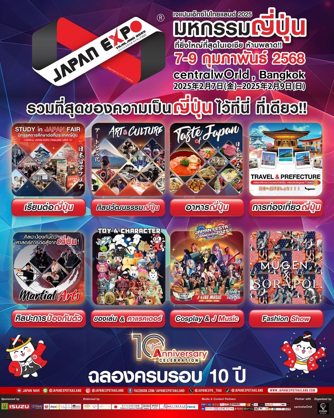 ศูนย์การค้าเซ็นทรัลเวิลด์ ไลฟ์สไตล์เดสติเนชันระดับโลกใจกลางเมือง ร่วมกับ บริษัท จี-ยู ครีเอทีฟ จำกัด ผนึกกำลังเหล่าพันธมิตรทั้งภาครัฐและเอกชน ฉลองยิ่งใหญ่ ครบรอบ 10 ปี งาน JAPAN EXPO THAILAND 2025 มหกรรมญี่ปุ่นที่ยิ่งใหญ่ที่สุดในเอเชีย โดยมี ดร.ณัฐกิตติ์ ตั้งพูลสินธนา กรรมการผู้จัดการใหญ่ สายงานการตลาด บริษัท เซ็นทรัลพัฒนา จำกัด (มหาชน), ยุพเรศ เอกธุระประคัลภ์ ประธานบริษัท จี-ยู ครีเอทีฟ จำกัด และ โทโมมิ โคบายาชิ รองประธาน บริษัท จี-ยู ครีเอทีฟ จำกัด ร่วมประกาศไฮไลต์การฉลองครบรอบ 10 ปี ในคอนเซ็ปต์ Celebrate 10th Anniversary ที่ปีนี้จัดเต็มอีเวนต์ครบทุกมิติ รวบรวม “ที่สุด” ของญี่ปุ่นไว้ภายในงานเดียว เต็มอิ่มไลฟ์สไตล์เจแปน ไม่ว่าจะเป็น อาหาร แฟชั่น ท่องเที่ยว การศึกษา วัฒนธรรม พร้อมความบันเทิงทุกรูปแบบไว้มากถึง 19 โซนที่ต้องเก็บให้ครบ กับ 11 ไฮไลต์อีเวนต์ บน 7 เวที ระหว่างวันที่ 7-9 กุมภาพันธ์ 2568 เต็มพื้นที่ทั้งด้านในและลานหน้าศูนย์การค้าเซ็นทรัลเวิลด์