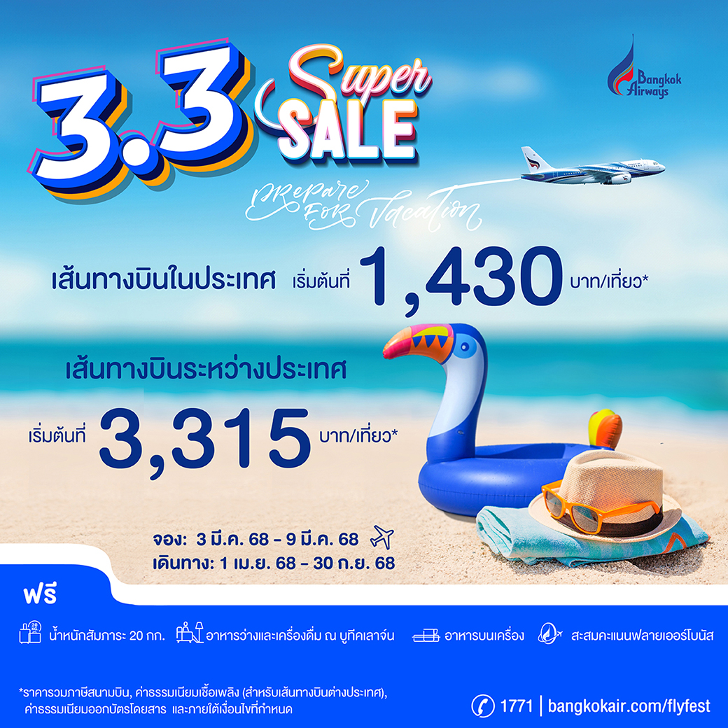 บริษัท การบินกรุงเทพ จำกัด (มหาชน) หรือ สายการบินบางกอกแอร์เวย์ส เสนอโปรโมชั่นพิเศษ “3.3 Super Sale” เตรียมเก็บกระเป๋าให้พร้อม แล้วพุ่งตัวไปพักร้อน ด้วยตั๋วเครื่องบินราคาสุดคุ้มสำหรับเส้นทางบินภายในประเทศ เริ่มต้นที่ 1,430 บาท/เที่ยว* และเส้นทางบินระหว่างประเทศ เริ่มต้นที่ 3,315 บาท/เที่ยว* เปิดจองพร้อมกันทางเว็บไซต์ http://www.bangkokair.com/flyfest ตั้งแต่วันที่ 3-9 มีนาคม 2568 และเดินทางได้ตั้งแต่วันที่ 1 เมษายน -30 กันยายน 2568