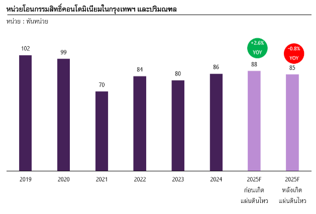 การเปิดโครงการคอนโดมิเนียมใหม่ในปี 2025 จะยังมีแนวโน้มหดตัวต่อเนื่อง โดยเผชิญแรงกดดันหลักจากกำลังซื้อกลุ่มรายได้ปานกลาง-ล่างที่ยังไม่ฟื้นตัว และมีข้อจำกัดในการเข้าถึงสินเชื่อเพื่อที่อยู่อาศัย ขณะที่แนวโน้มการชะลอการโอนกรรมสิทธิ์ หรือการตัดสินใจซื้อคอนโดมิเนียมจากแผ่นดินไหว เป็นแรงกดดันให้หน่วยเหลือขายสะสมคอนโดมิเนียมในกรุงเทพฯ และปริมณฑลในปี 2025 ยังอยู่ในระดับสูงราว 74,000 หน่วย อย่างไรก็ตาม ยังต้องจับตาการปรับแผน
