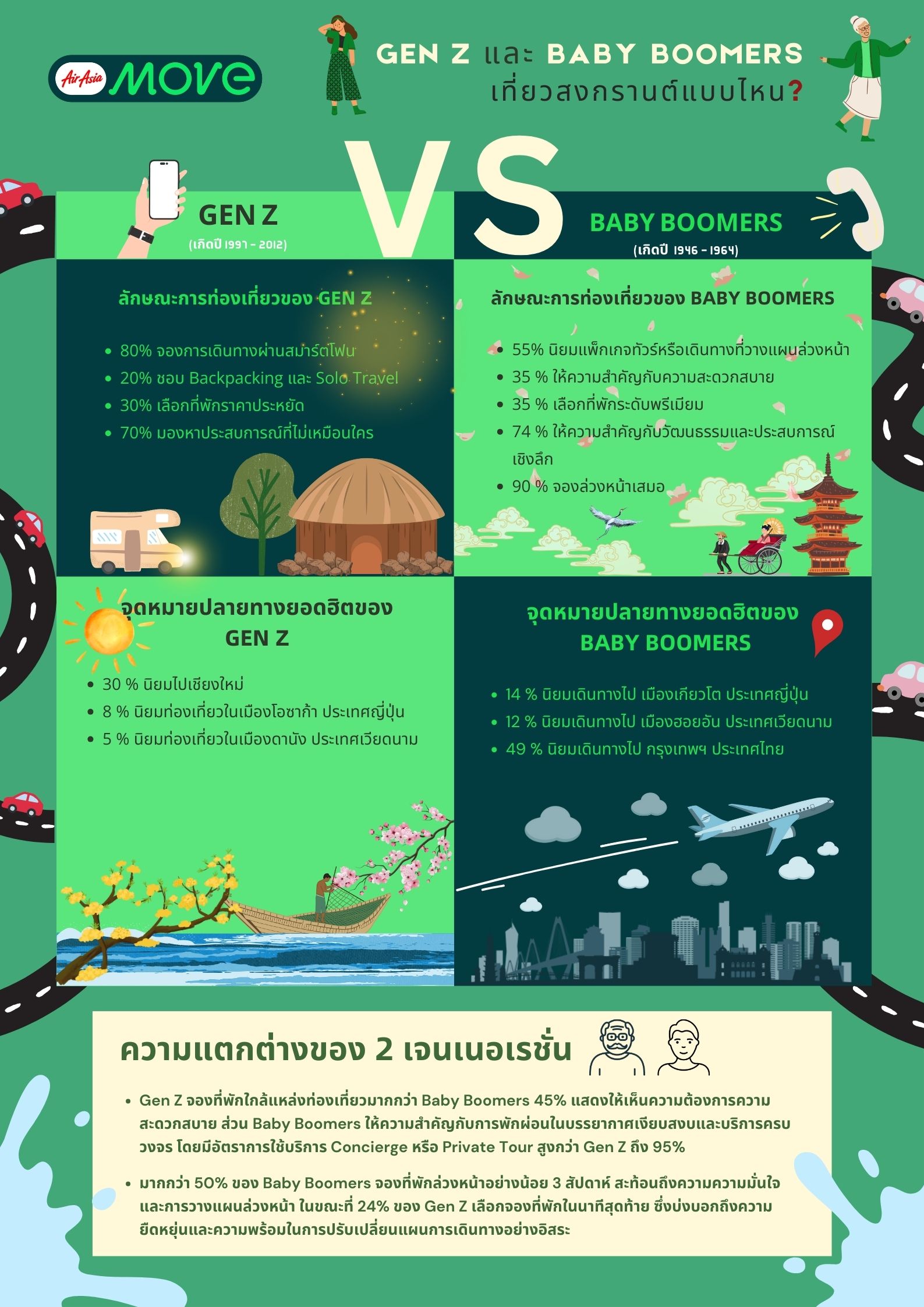 สงกรานต์เป็นช่วงเวลาสำคัญของการท่องเที่ยว แต่รู้หรือไม่? พฤติกรรมการเดินทางของแต่ละเจเนอเรชั่นแตกต่างกันอย่างสิ้นเชิง จากฐานข้อมูลของ AirAsia MOVE ซึ่งเป็นแพลตฟอร์มจองที่พักและเที่ยวบินชั้นนำ เราพบว่ากลุ่ม Gen Z (เกิดปี 1997-2012) และ Baby Boomers (เกิดปี 1946-1964) มีแนวโน้มการเดินทางที่แตกต่างกันอย่างชัดเจน ทั้งเรื่อง วิธีจอง จุดหมายปลายทาง และไลฟ์สไตล์ในการท่องเที่ยว