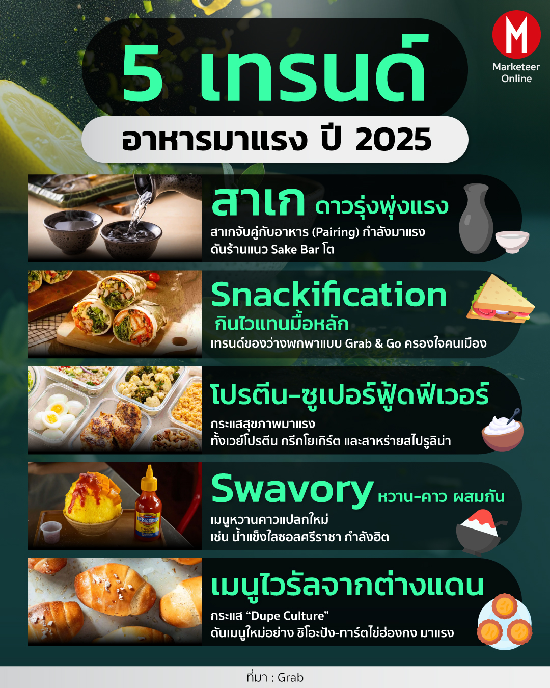 เผย 5 เทรนด์อาหารที่น่าจับตามองในปี 2025 พบดาวรุ่งดวงใหม่อย่าง ‘สาเก’ มาแรงกับการแพริ่งกับอาหารที่ช่วยทำให้ภาพลักษณ์ทันสมัยขึ้น ขณะที่เทรนด์สแน็กรองท้อง และอาหารเพื่อสุขภาพยังคงเติบโตในวงกว้างโดยเฉพาะกระแส ‘โปรตีน-ซูเปอร์ฟู้ดฟีเวอร์’