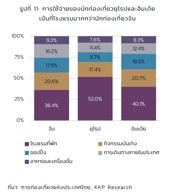2) ในมิติของรูปแบบการใช้จ่ายของนักท่องเที่ยว ที่แตกต่างจากนักท่องเที่ยวจีน โดยนักท่องเที่ยวยุโรปและอินเดียใช้จ่ายกับที่พักและโรงแรมมากกว่านักท่องเที่ยวจีน ขณะเดียวกันมีการเดินทางภายในประเทศต่ำกว่า สะท้อนว่านักท่องเที่ยวกลุ่มนี้มักจะท่องเที่ยวเพียงไม่กี่สถานที่และให้ความสำคัญกับคุณภาพของที่พักเป็นหลัก โดยนักท่องเที่ยวอินเดียจะให้ความสำคัญกับกิจกรรมบันเทิงต่าง ๆ และการช้อปปิ้งมากกว่าชาวยุโรป