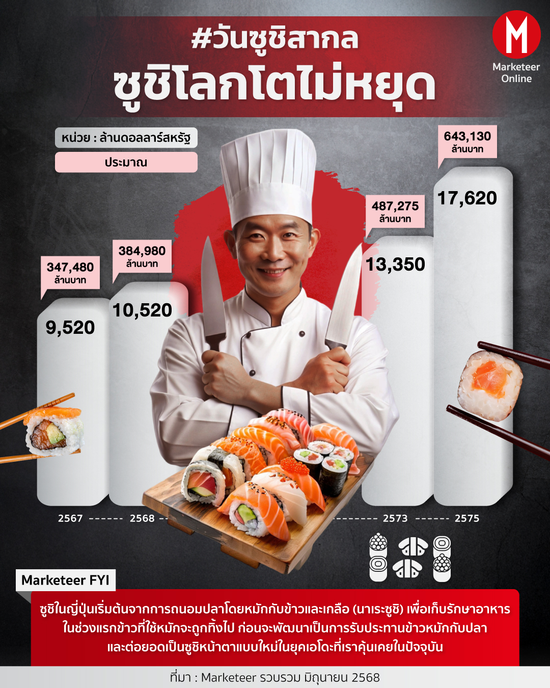 เมื่อพูดถึงอาหารญี่ปุ่นที่มีอิทธิพลระดับโลก หนึ่งในนั้นย่อมต้องมีชื่อของ “ซูชิ” ติดอยู่ในลิสต์อย่างแน่นอน และในวันซูชิสากล 18 มิถุนายนนี้ ตลาดซูชิเป็นอย่างไร