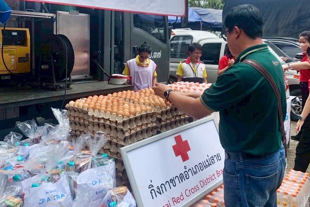 อีกด้านหนึ่ง ซีพีเอฟได้ร่วมร้อยเรียงความดี กับทีมซีพีอาสา และบริษัทในเครือซีพี มอบวัตถุดิบ อาทิ หมูบด อกไก่ ไข่ไก่ น้ำดื่ม และข้าวหอมมะลิ สำหรับประกอบอาหารช่วยเหลือบรรเทาความเดือนร้อนให้กับผู้ประสบอุทกภัย อ.แม่สาย ผ่าน “โรงครัวสนาม มณฑลทหารบกที่ 37” และ “กิ่งกาชาดอำเภอแม่สาย” โดยมี ร้อยเอก ธวัช เขื่อนขันติ์ หัวหน้าชุดรถครัวสนาม มทบ.37 และ นางสิริพร ศรีจันทร์ รองนายกกิ่งกาชาดอำเภอแม่สาย ร่วมรับมอบ