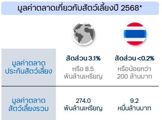 โดยในภาพรวมของโลกจากการรายงานของ Knowledge Sourcing Intelligence (KSI) คาดการณ์มูลค่าตลาดประกันภัยสัตว์เลี้ยงทั่วโลกในปี 2568 อยู่ที่ราว 8.5 พันล้านเหรียญฯ และคาดว่าจะเพิ่มเป็น 17.2 พันล้านเหรียญฯ ในปี 2573 ที่อัตราเติบโตเฉลี่ย 15% ต่อปี ซึ่งเติบโตในสัดส่วนที่ใกล้เคียงกับมูลค่าสัตว์เลี้ยงรวม