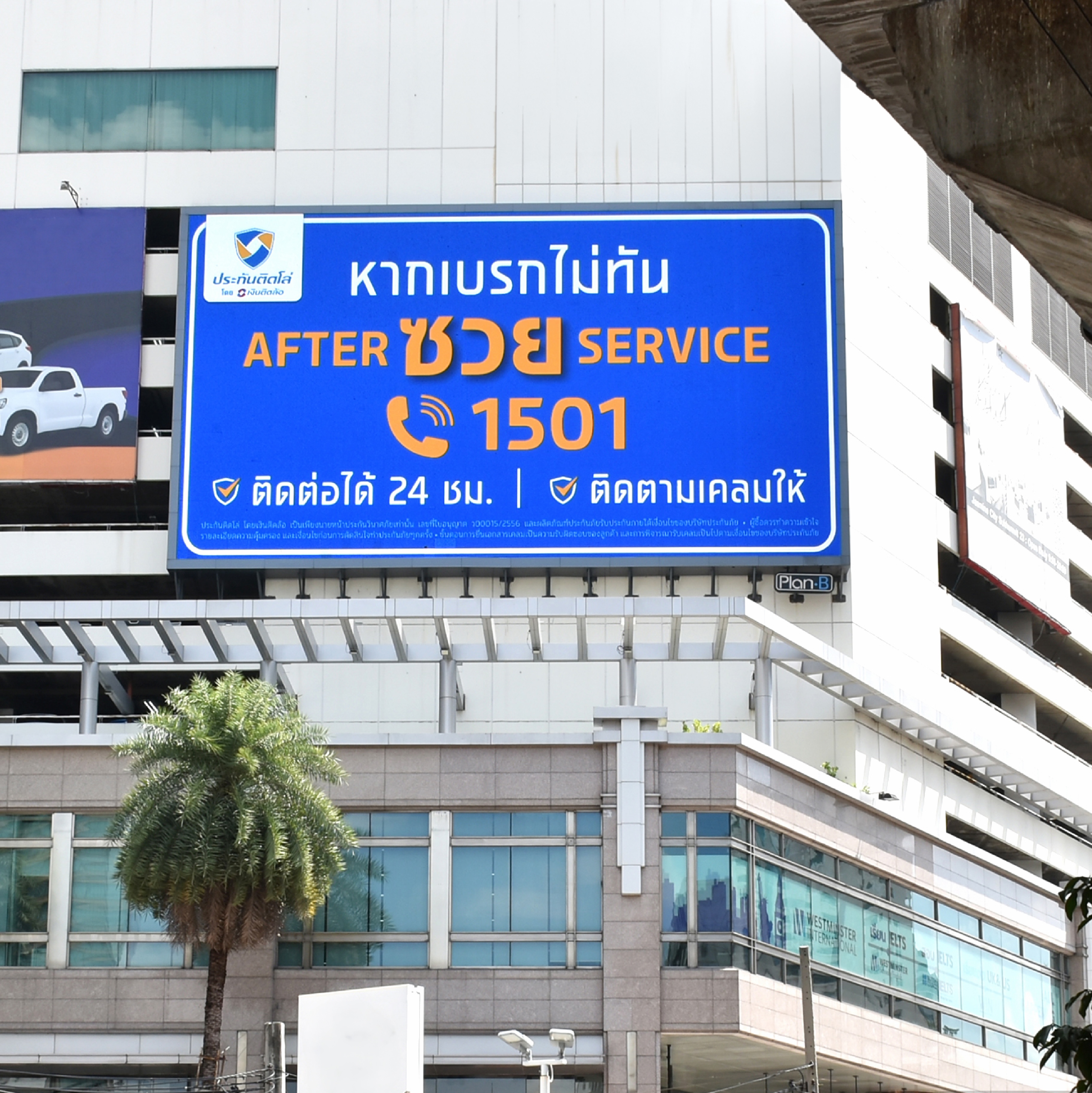 - ดักเจอในจุดที่ใช่ (On-Ground Focus) ล่าสุด แบรนด์รุกหนักด้วยสื่อ OOH ที่บุกไปอยู่ใน “จุดเสี่ยงซวย” ในชีวิตจริง ไม่ว่าจะเป็นทางด่วนที่รถชอบเสีย, สี่แยกที่ชนกันบ่อย, หรือบนสถานี BTS ในชั่วโมงเร่งด่วน เพื่อย้ำเตือนว่าความซวยเกิดขึ้นได้ทุกที่และทุกเวลา และเมื่อมันเกิดขึ้น แค่โทรเบอร์ 1501 ประกันติดโล่พร้อมช่วยเหลือตลอด 24 ชม.