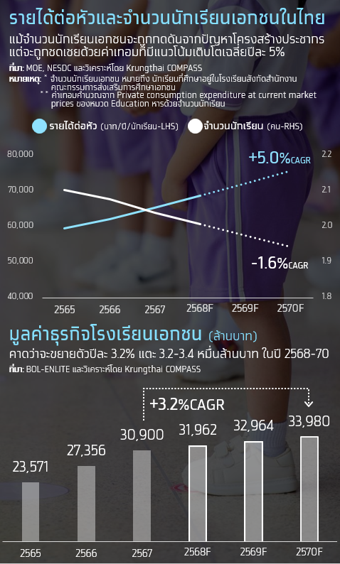 - Krungthai COMPASS ประเมินธุรกิจโรงเรียนเอกชนในปี 2568-70 ว่าจะอยู่ในระดับ 2-3.4 หมื่นล้านบาท ขยายตัวปีละ 3.2% แต่ถือว่าชะลอตัวลงจากในอดีต ตามแรงกดดันของ Aging Population โดย การเติบโตจะมาจากการเพิ่มรายได้ต่อนักเรียนเป็นหลัก ทั้งการเพิ่มหลักสูตรพิเศษ หรือการขยายบริการเสริมรอบตัวนักเรียน