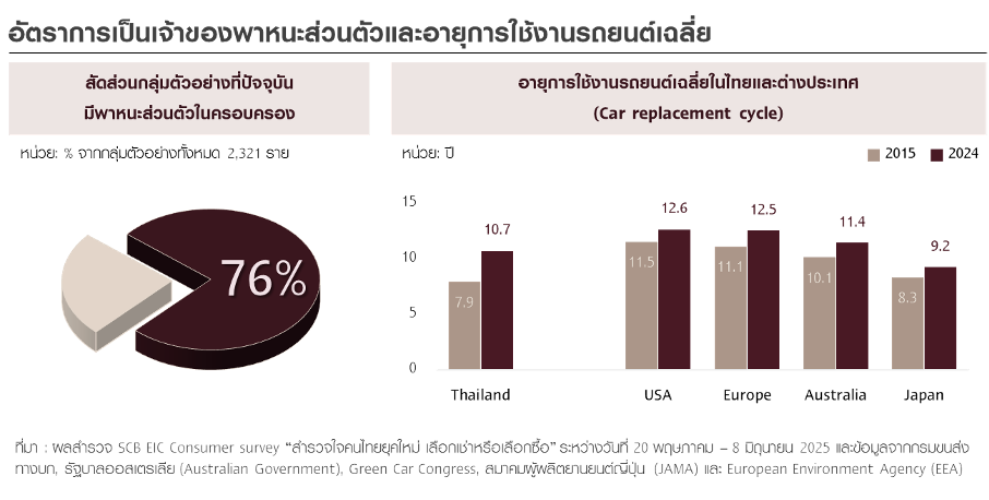 แม้ว่าการมีพาหนะส่วนตัวยังคงเป็นค่านิยมสำคัญของคนไทยจำนวนมาก แต่รูปแบบการตัดสินใจซื้อและการใช้งานกลับมีแนวโน้มเปลี่ยนแปลงไป เจ้าของยานยนต์ในปัจจุบันมักยืดอายุการใช้งานพาหนะส่วนตัวให้นานขึ้น ขณะที่ผู้บริโภคที่กำลังมองหารถคันแรกก็เริ่มให้ความสนใจกับรถยนต์ไฟฟ้า (xEV)