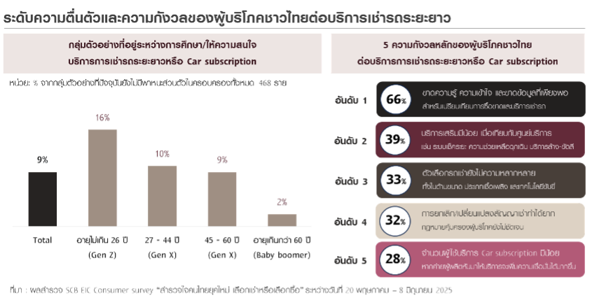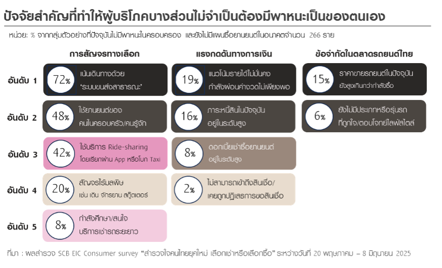 ไม่เพียงเท่านี้ ผลการวิเคราะห์ SCB EIC Consumer survey ยังชี้ว่า การเป็นเจ้าของยานยนต์ก็เริ่มไม่ได้เป็นเงื่อนไขจำเป็นดังเช่นในอดีต โดยเฉพาะในเขตเมืองที่ระบบขนส่งสาธารณะได้รับการพัฒนาอย่างต่อเนื่อง รวมถึงบริการ Ride-sharing ก็ได้กลายมาเป็นทางเลือกหลักสำหรับหลายคน เพราะในบางกรณีก็สามารถตอบโจทย์ความสะดวกสบายได้ดีกว่าการใช้งานพาหนะส่วนตัว ขณะที่บริการเช่ารถระยะยาวหรือ Car subscription ก็เริ่มได้รับความสนใจมากขึ้น โดยเฉพาะในกลุ่มคนรุ่นใหม่ที่นิยมไลฟ์สไตล์ยืดหยุ่นและต้องการการทดลองเทคโนโลยีขับขี่ใหม่ ๆ