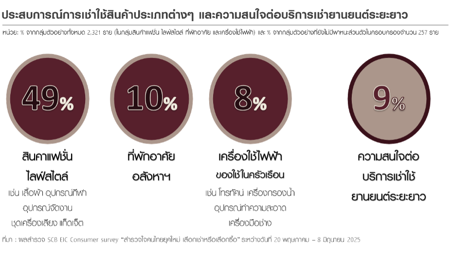 SCB EIC ได้จัดทำแบบสำรวจพฤติกรรมผู้บริโภค (SCB EIC Consumer survey) ภายใต้หัวข้อ “สำรวจใจคนไทยยุคใหม่ เลือกเช่าหรือเลือกซื้อ” พบว่า พฤติกรรมการเช่าใช้ของผู้บริโภคชาวไทยมีลักษณะเด่น 3 ประการ ได้แก่