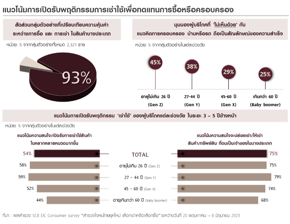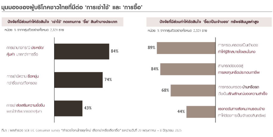 2) แม้ว่าการเช่าใช้ตอบโจทย์ผู้บริโภคที่ให้ความสำคัญกับความคุ้มค่าและความยืดหยุ่น แต่คนไทยส่วนใหญ่ยังมีค่านิยมต้องการเป็นเจ้าของที่อยู่อาศัยและยานยนต์ เพราะมองว่าสินทรัพย์มูลค่าสูงเหล่านี้สะท้อนความมั่นคงและความสำเร็จในชีวิต และ