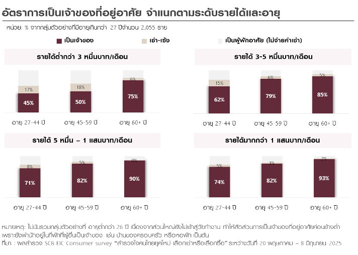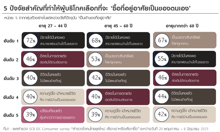ผลสำรวจของ SCB EIC พบว่า คนไทยส่วนใหญ่ยังคงต้องการมีที่อยู่อาศัยเป็นของตนเอง เพราะมองว่าเป็นสัญลักษณ์ของความมั่นคง ฐานะทางสังคม และเป็นความภาคภูมิใจของชีวิต ขณะที่มาตรการสินเชื่อและโครงการบ้านหลังแรกมีส่วนช่วยให้ผู้มีรายได้ปานกลางสามารถก้าวสู่การเป็นเจ้าของบ้านกันได้ง่ายขึ้น