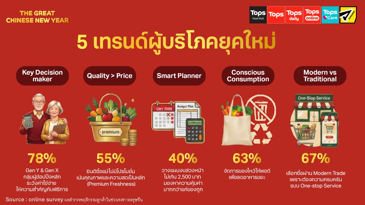 ข้อมูลจากการสำรวจอินไซต์ลูกค้าของ ท็อปส์ ผ่านช่องทาง LINE TOPS Thailand และบริการ Personal Shopper พบว่า กลุ่มผู้มีบทบาทหลักในการตัดสินใจจับจ่ายช่วงตรุษจีนยังคงเป็น Gen X และ Gen Y รวมกันกว่า 78% โดยส่วนใหญ่อาศัยอยู่ในกรุงเทพฯ และปริมณฑล และให้ความสำคัญกับการไหว้เจ้าอย่างถูกต้องตามประเพณี ทั้งการเตรียมของไหว้ การทำความสะอาดบ้าน และการหลีกเลี่ยงสิ่งอัปมงคล