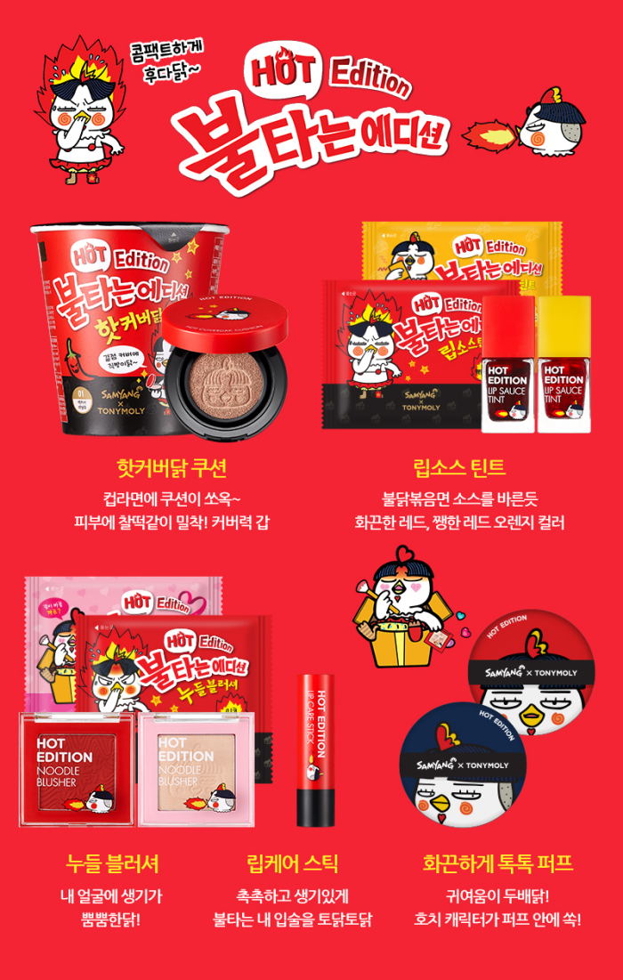 และใช้ชื่อคอลเลคชั่นนี้ว่า Samyang X Tony Moly Hot Edition มีออกมาถึง 6 ไอเทม แถมทำออกมาได้น่ารักน่ากินเสียด้วย